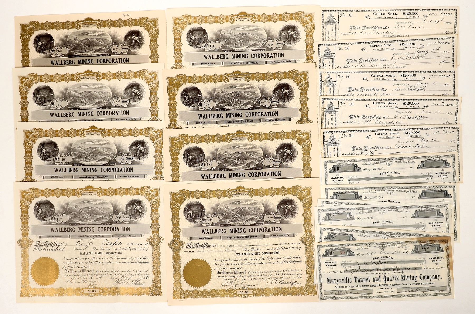 A collection of 20 stock certificates from three mining companies that operated in Marysville, California: Turner Gold Mining Company (5), Marysville Tunnel and Quartz Mining Company (6), and Wallberg Mining Corporation (10). All Turner Gold and Wallberg stocks are issued; they are signed by the president and secretary of their respective companies and bear embossed company seals. All Marysville Tunnel and Quartz stocks are unissued. Beautiful vignettes of mining scenes on the Wallberg certificates. All in good condition, some creasing from storage.