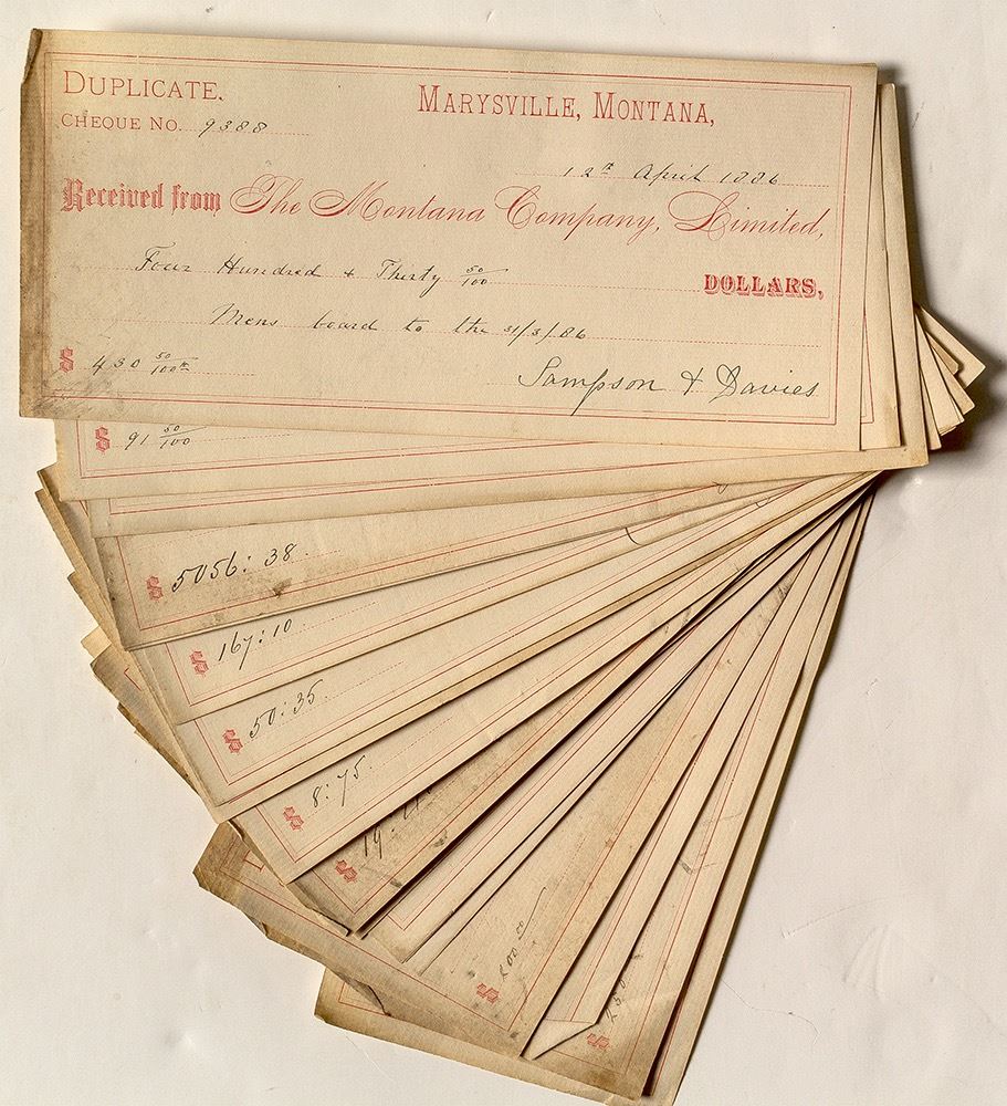 Lot of 21 checks from The Montana Company, Limited, in Marysville, Montana, issued in 1886. 3.75" x 8.5" with varying levels of soiling. Marysville was at one time the largest producer of gold in Montana. The original claim which became the district's most successful mine, the Drumlummon, was discovered in 1876 by Thomas Cruse. Cruse named the mine after his Irish homeland. He got help to develop the vein and news spread quickly of the richness of the find. A London based company bought the Drumlummon from Cruse in 1882 and formed The Montana Company, Limited. Cruse had success in banking and eventually reinvested in Marysville mining. At one time, the town boasted as many as 4,000 residents. Legend has it that Cruse named it Marysville because of the first female resident, Mary Ralston. City: Marysville State: Montana Date: 1886 ID: 36652