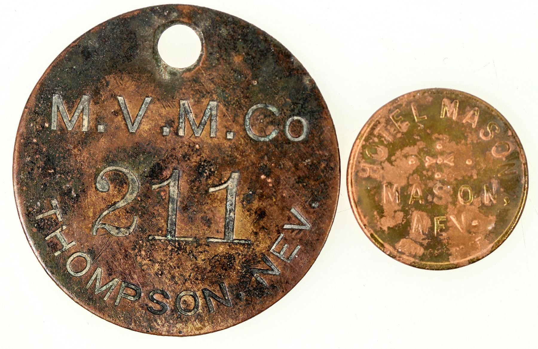 Mason Valley Mining Co. equipment tag and Hotel Mason medal. The Mason Valley site primarily mines copper to this day, but has hit veins of gold and silver before. Both medals are in good condition, though minor rust is present. The Hotel Mason token's once golden exterior has peeled to reveal a rosy copper-tone finish underneath. See photo.