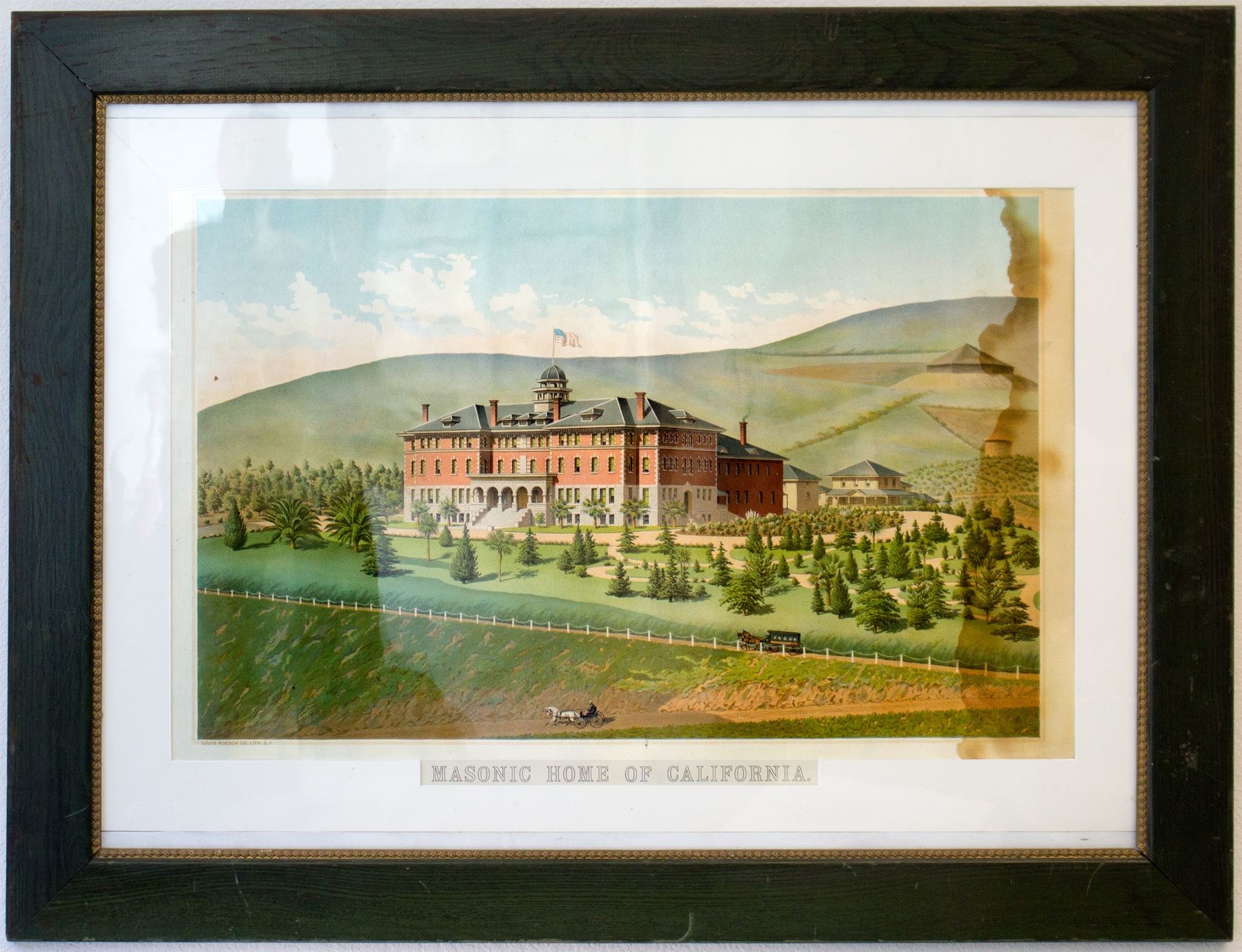 This lithograph depicts the Masonic Widows and Orphans Home in Decoto, California surrounded by hills. Lithographer is Louis Roesch. C1890. [The only example we could find online was from the Bancroft Library.] Serious staining on the right hand side of the poster (about 3”). 31x40” with frame. Due to size and delicate nature, additional shipping charges may apply. State: California City: Decoto HWAC#: 47330 Date: c1890