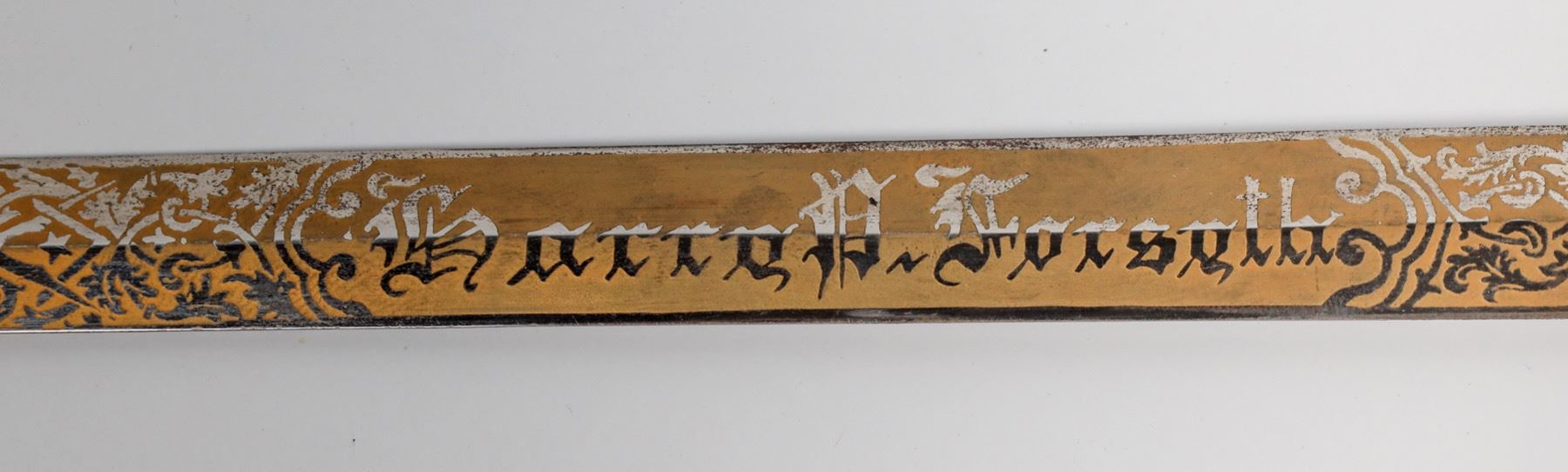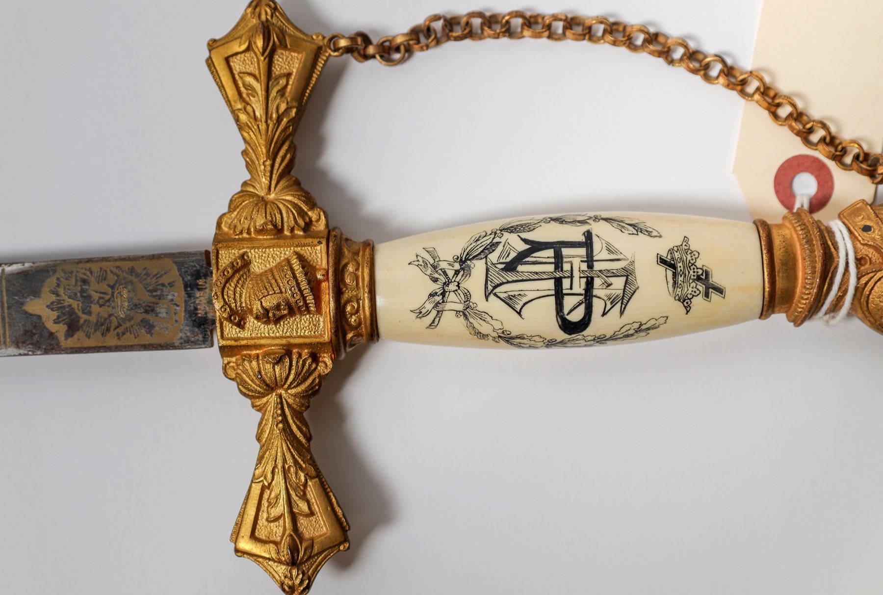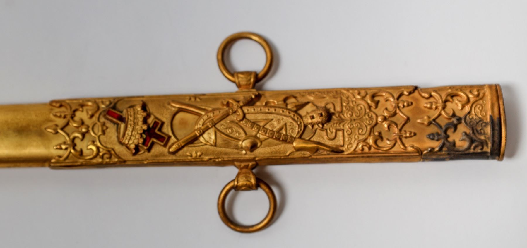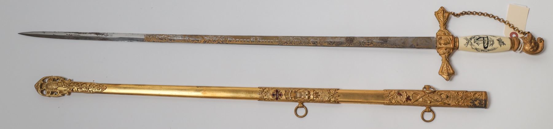 Knights Templar ceremonial Freemason's sword and scabbard. Sheath and sword measure 38 in. Sheath is gold color indicating a Commander of U.S. Lodge and has red Christian cross inside a crown beneath shield and sword. Sword blade is 30", has a knights head pummel, ivory white grip with Christian cross and triangle on one side and crown w/cross through it and the owners initials in a wreath. Knuckle guard has a knights head w/chain attached to the pummel. The blade ornate is crusader scenes, owners name engraved " Harry P. Forsythe". Manufacture by Cincinnati Regalia Co. Cincinnati, OH. Overall good condition with some minor wear from use.