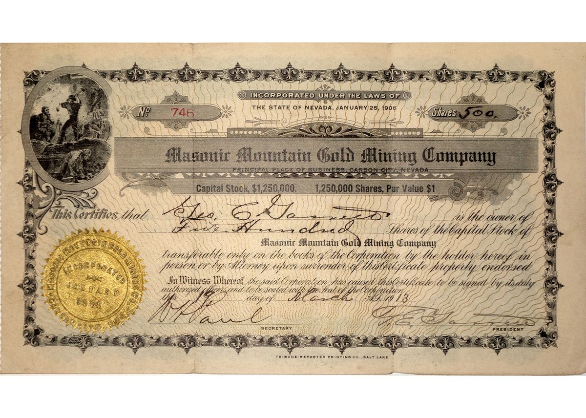 Cert. #746, issued in 1913 to Geo. C. Garrett for 500 shares. Signed by F.E. Garrett as president and Wm. H. Paul as secretary. Inc. in Nevada in 1908. The company had lands, 7 claims, 70 miles from a railway, having 2 fissure veins in granite and porphyry, ranging from 3' to 30' in width. The veins carried oxidized ores and occasional native copper, with assays of 1 to 18% copper and $4 to $30 gold per ton. Masonic is now a ghost town located in Mono County, about 12 miles ne of Bridgeport. Gold deposits were discovered near Masonic in 1860 and the new mining district was created. The district was named Masonic, because a large number of the workers were Free Masons. Small mining vignette at top left. Uncancelled.