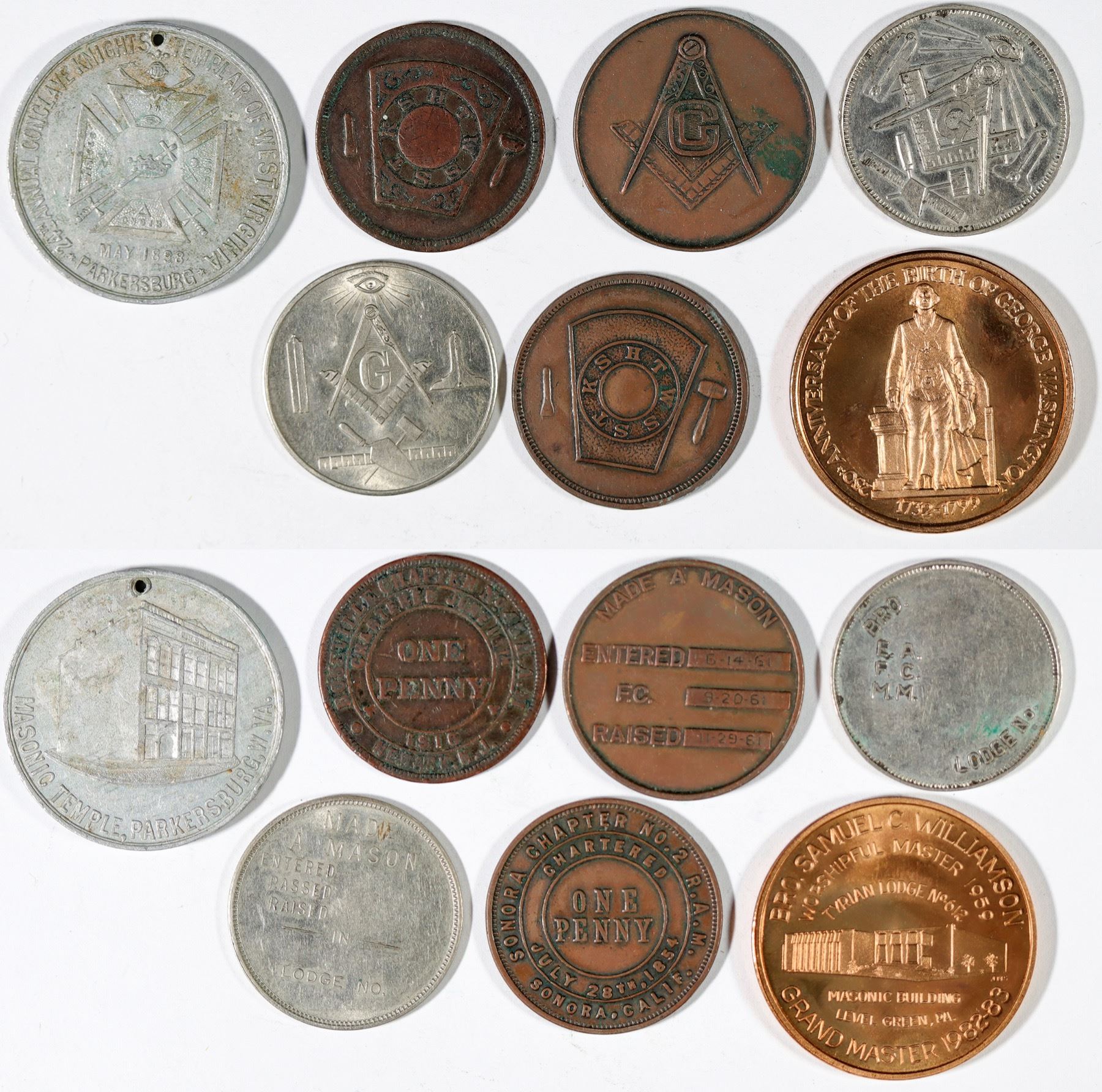 Lot of seven medals from the fraternal organization. Two Masonic pennies: Sonora, California, Newark, New Jersey; Masonic Temple, Parkersburg, West Virginia; Grand Master, Level Green, Pennsylvania; two "made a mason" medals, lodge token.