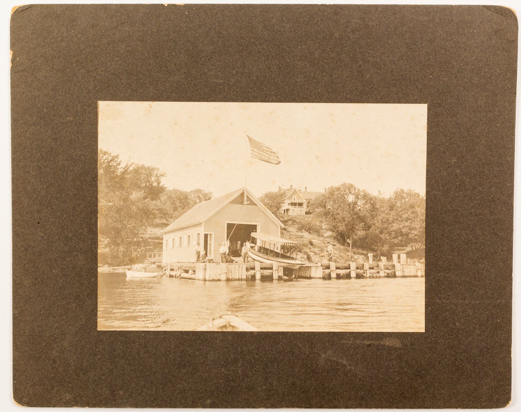 Choice vintage photo of a boat on a boathouse ramp in Massachusetts, 42 star US flag. By JR O'Hara, Jr. in Winthrop, Mass. Photo is 4.5" x 6.5", matting 8" x 10".