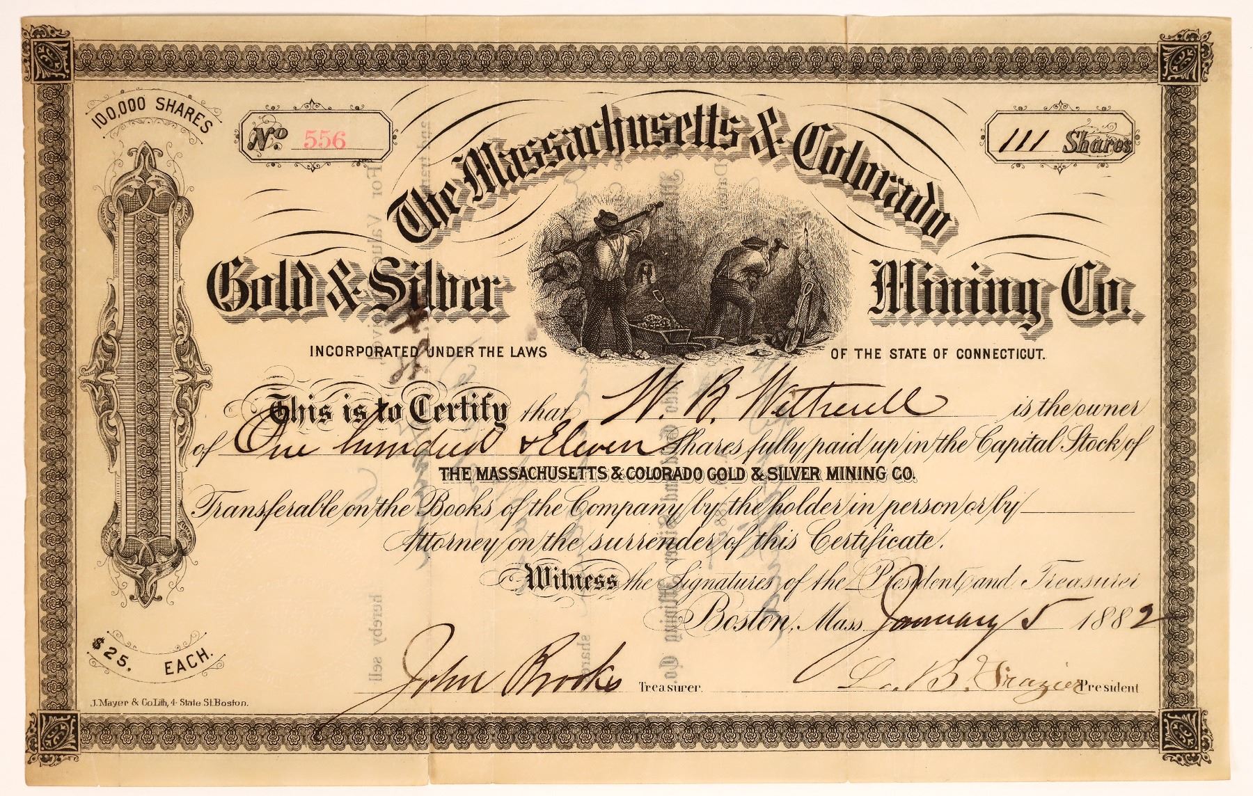 Issued at Boston, Mass. in 1882. Incorporated in Connecticut. Cert. #556,issued for 111 shares to W.B. Witherell and signed by W.B. Frazier as president and John Brooks as treasurer. Shares were $25 Each. Two miners working underground. We could find no specific information about this company. J. Mayer & Co. Lith, Boston. Fold splits. Not in C&L.