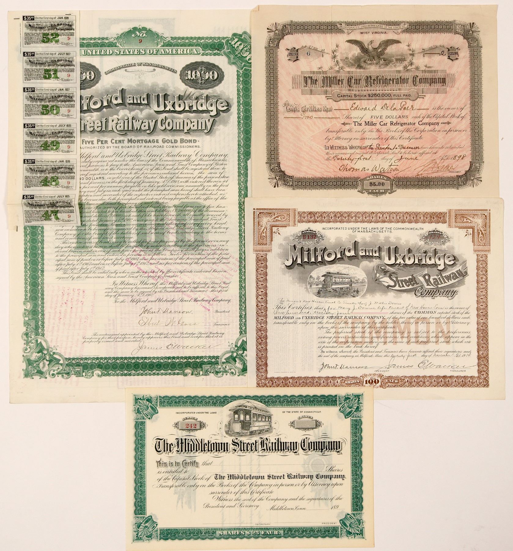 1. The Miller car Refrigerator CO, I/U, #6 2 shares common stock @$5.00 par, issued June 21, 1898 signed G.A. James President, BLACK, embossed seal, vignette eagle wings spread w/chicks. vignette rose underprint. 2.The Middletown Street Railway Co, U/U, GREEn< common shares @$25 par, vignette of street car r-l. 3. Milford and Uxbridge Street Railway CO, I/U, #B132 124 shares @$!00 par issued Nov 21, 1914, signed James Walker President, BROWN, embossed seal, vignette electric street car r-l, Hobbs & Warren printer. 4. Milford and Uxbridge Street Railway CO I/C #9 $1000 5% mortgage gold bearer bond, issued Jan 1, 1902 singed James E. Walker President, GREEN, embossed seal, no vignette , Company title overprint of cloud background, "1000" green underprint, two revenue stamps on reverse. F.L. Butman printer. Ken Prag Collection