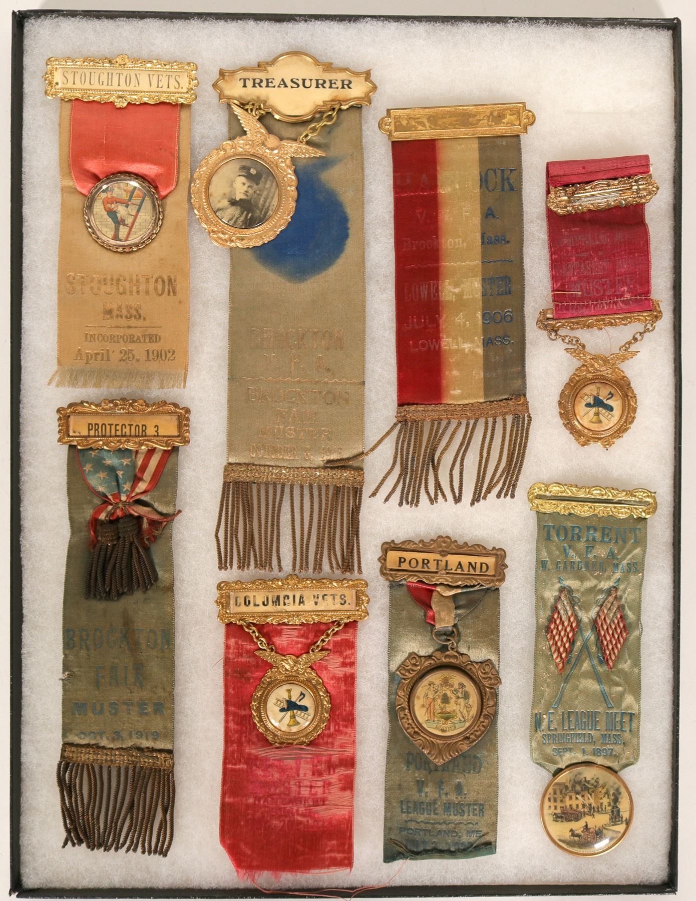 1902 pictorial Stoughton Vets-faded. 1915 photo Brockton Treasurer-faded. 1906 Brockton-fading. red-faded. 1919 Brockton-signs of age. 1914 Columbia Vets-signs of age. 1920 pictorial Porland. 1897 pictorial Springfield