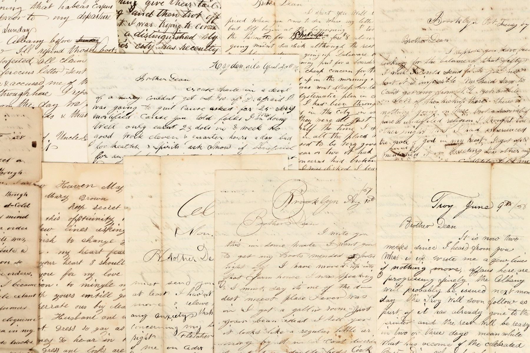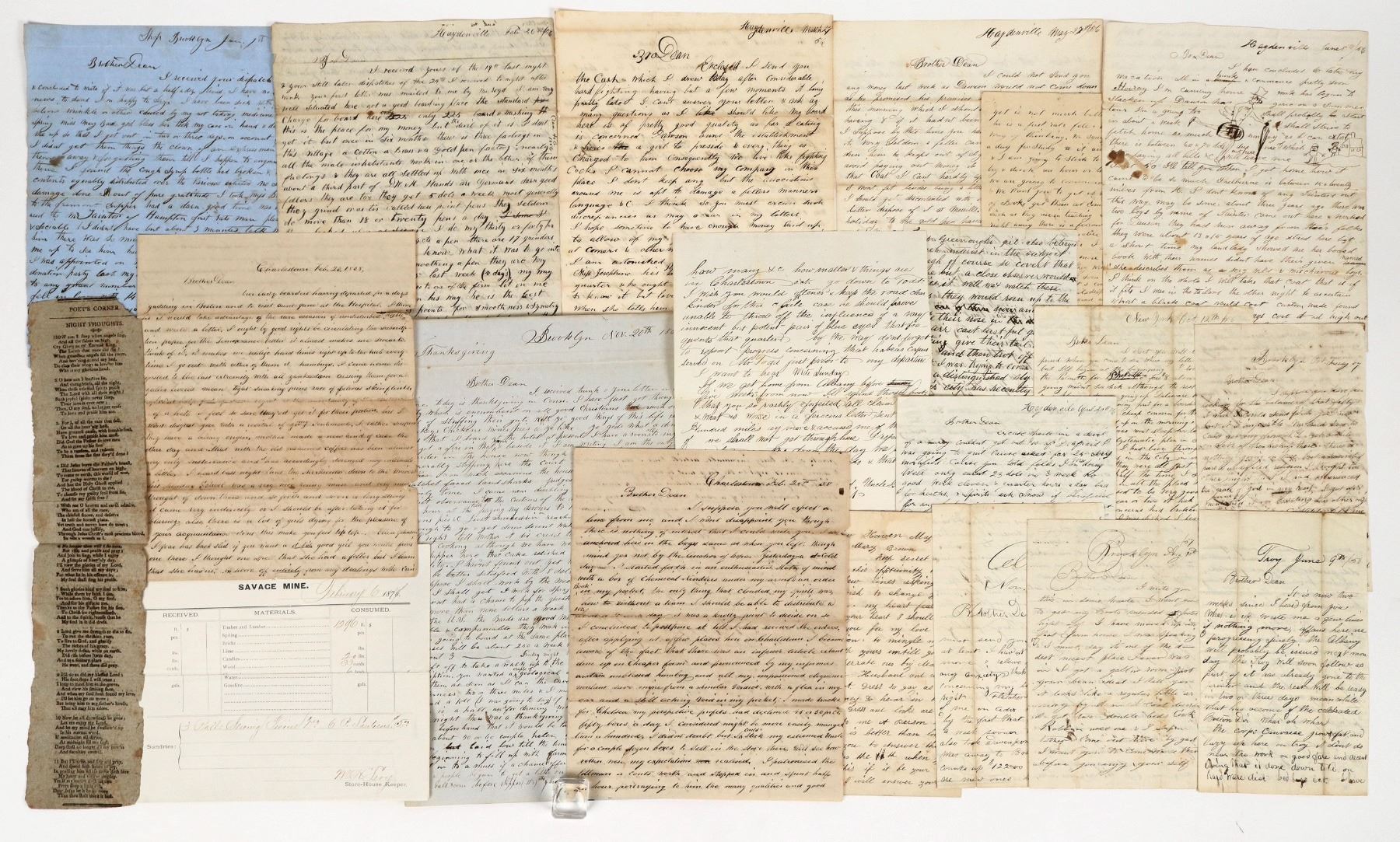 About fourteen letters from Daniel Tainter of Charlestown, Massachusetts, sent to his brother Dean. The letters date from 1856 to 1858. In these letters, Daniel describes his life as he travels through Massachusetts and New York, living at times in Brooklyn, Haydenville, and Charlestown. His descriptions provide a vivid glimpse of daily life in pre-Civil War Massachusetts, as he describes the living conditions of various boarding houses, his failed stint as a travelling salesman, failures and successes in courtship, patriotic political displays in Charlestown, church life, and his experience working in a factory (an ordeal he describes as leaving him with "no enterprise, energy, or ambition... dead, dead, dead.") He also discusses his thoughts on the political landscape of the time, a mere few years before the beginning of the Civil War. The letters have some wear and tearing around the edges consistent with their age but are overall legible and in good condition.