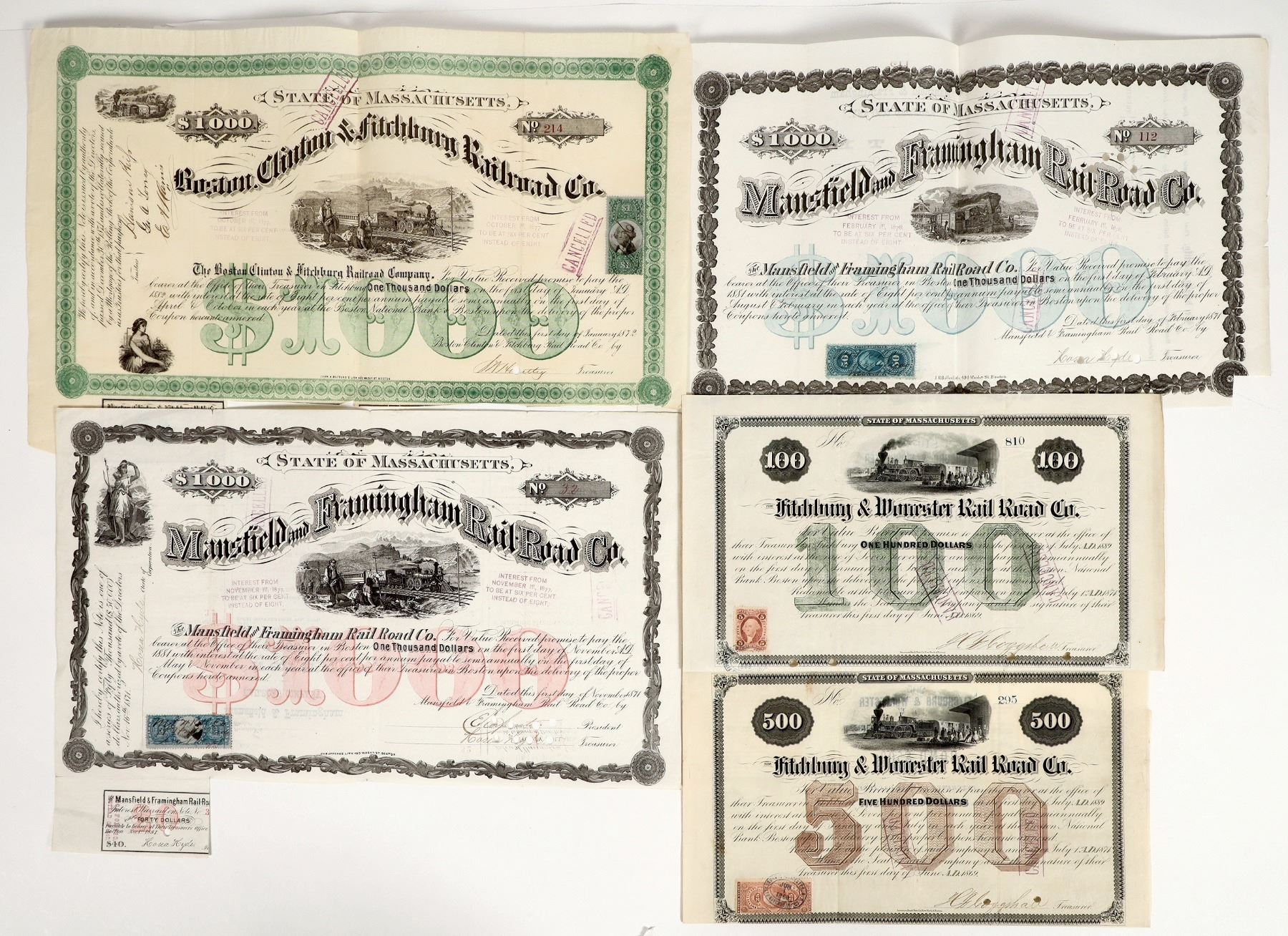 Lot of 5. 1. I/C, two #295 & 810. The Fitchburg & Worcester Rail Road Co., $100 and $500, 7 % bearer bond. Issued 1869m due 1889. Vignette 4-4-0 @depot top center. 25c revenue stamp on #295 and 5c revenue stamp on #810. Coupons attached. American BNC printer. 2. I/C, #214. The Boston, Clinton & Fitchburg Railroad Co ., $1000, 8% bearer bond, issued 1872, due 1882. "$1000" green underprint. Vignette center 4-4-0 passenger train field workers. One coupon attached. John H Bufford's Litho printer. Bi-fold crease. 3. I/C, two #32 & 112. Mansfield and Framingham Rail-Road Co., $1000, 8% bearer bond. Issued 1871, due 1881. "$1000" in underprint, 50c revenue stamp lower left on each bond, one coupon attached each, #112 has lower right corner missing. . J.H. Bufford Litho printer.. Unless noted all bonds are in near EF cond.