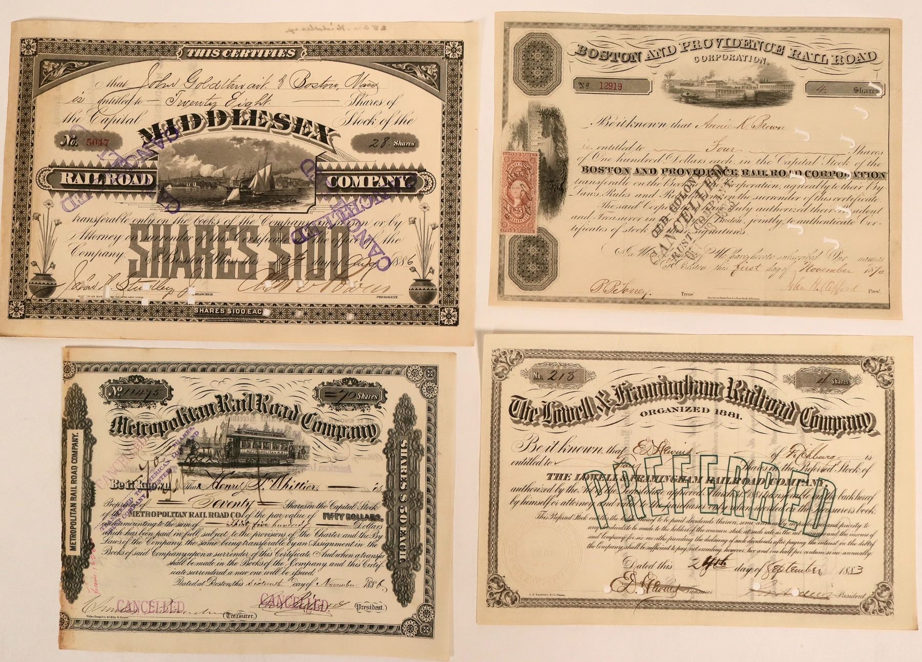 4 certificates. 1. Metropolitan Rail Road Co. incorp.1855. #11475, I/C, $50 par issued NOv 1886, BLACK, vignette top of horse drawn streetcar l-r w/ company name on side, Walker, Young & Co. printer. VF 2. The Lowell & Framingham Railroad Co. incorp 1881. #218, I/C, preferred issued Sept 1883, signed not readable, Black, no vignette, embossed seal. PREFERRED gren underprint.L.F. Lawrence & Co. printer. EF 3. Boston and Providence Railroad Corp. incorp.June 21. 1831. Chartered the next day to build a railroad between Boston and Providence, Rhode Island. #12919, I/C, $100 par issued Nov 1870. Signed J.H. Clifford Pres. Black, vignettes: Canton Viaduct left side, top harbor scene. Revenue stamp left side, American Bank Note Co. EF 4. Middlesex Railroad Co. incorp. 1854. #5047, I/C, shares $100 (grey underprint) issued Aug. 1886. signed by president not readable. Black, embossed seal, vignette harbor w/multiple ships. American Bank Note Co. VF