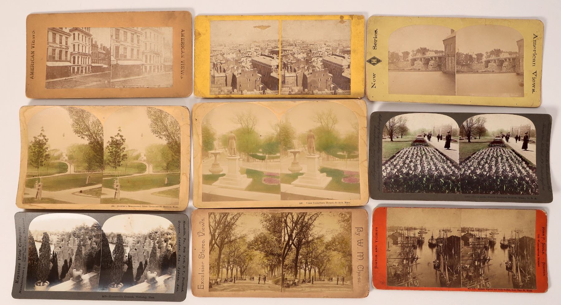 9 Massachusetts stereoviews with a few large format. Best is clipper ships in Boston Harbor. 2x State House, Daily Advertiser, Boston Common, Soldier's Monument, Public Gardens, Hunnewell's Grounds, Pawtucket Bridge. Some with low contrast, please inspect. [ Massachusetts