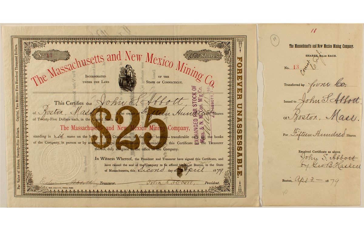 Early and rarer variety from this company before it consolidated the Plymouth Rock Mining Company. Cert. #13, issued in 1879. Incorporated in Connecticut. Issued to and signed as president to John S. Abbott and signed by Edwin Abbott as treasurer. Shares were $25 each, printed in gold. Issued at Boston, Mass. for 1500 shares. Stamp on the shares indicates this certificate was exchanged in 1881 for shares in the consolidated company. "Forever unassessable" printed in gold on the right. Cancellation lines through the two signatures. Also comes with the detached stub. VF.City: Silver CityCounty: GrantState: NMDate: