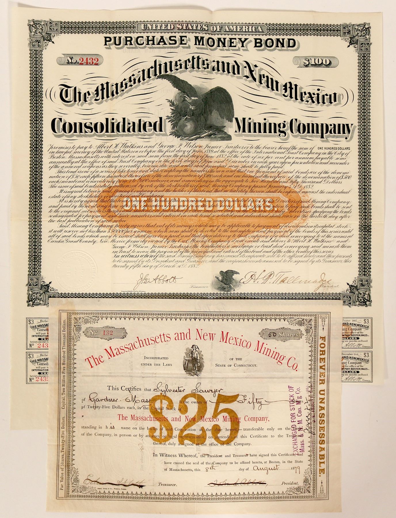 Lot of two. Massachusetts and New Mexico Consolidated Mining Company Bond. This is the rarer piece. 1882. JE Abbott and president HP Tallmadge. # 2432. 13 of 14 coupons attached. 14.5x16". Folds. No hole, edge, corner or discoloration issues. 2) Massachusetts and New Mexico Mining Company Stock. We have had this stock before, but this is in very nice condition. Some issues upper right border is all that mars it. Gold underprint '$25.' Title in red. Rand, Avery of Boston printers. # 132 to 50 shares to Sylvester Sawyer. Signed by Edward Abbott and John S Abbott. Cancelled. 1879. Six per cent $100 bond. Nice pairing connected by the Abbott family. Ken Prag Collection