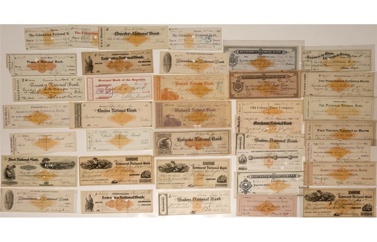 Lot of 38 checks from 1868 to 1901. Some unissued, many different cities. 7 RNB, 4 RNC, 4 RND, 18 RNG, 1 RNH, 2 RNM, 2 RNX.