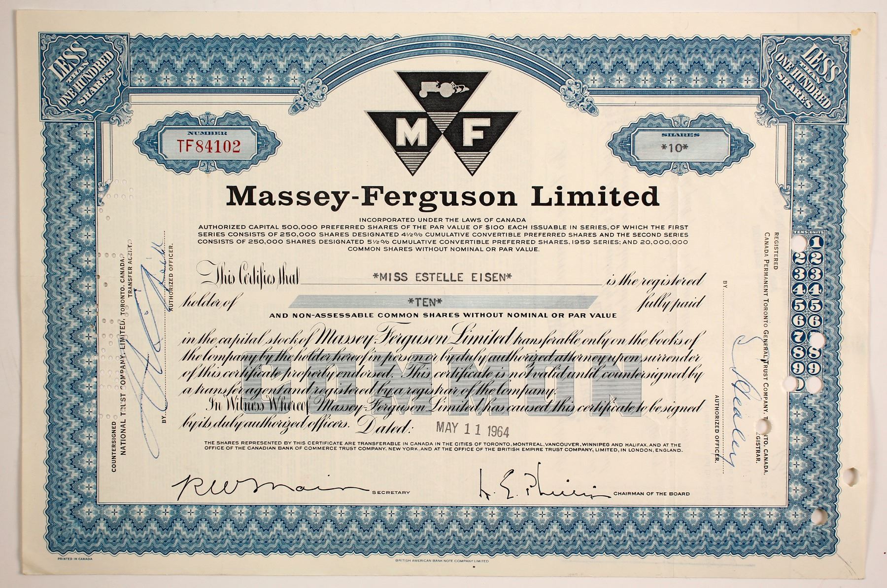 10 cancelled shares of Massey-Ferguson Ltd cert. # TF84102 issued to Miss Estelle Eisen on May 11, 1964. Signed by R W. Main, secy and L. E. Phuin, chairman of the board. Transferred on Nov 13, 1968. Blue border. Vignette with three triangles 1) M 2) F 3) tractor. Founded in 1847 in Newcastle, Ontario, by Massey as Newcastle Foundry and Machine Manufactory. Made some of world's first mechanical threshers. In 1879 renamed Massey Manufacturing Co. and moved to Toronto. With push on advertising Massey expanded and began to sell its products internationally, while becoming a well known brand in Canada. Printed: British American Bank Note Co., Ltd. Printed in Canada.