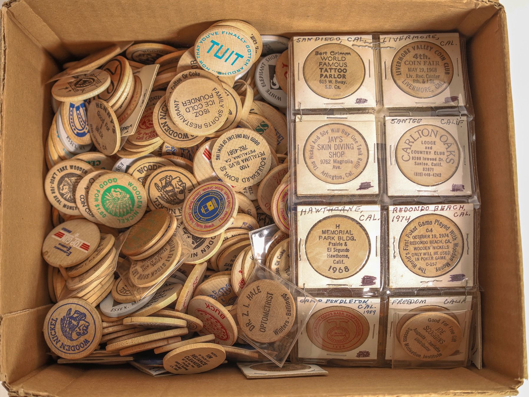 We are guessing over 700. Many Multiples. Includes, for example, Rosie’s Place New Orleans, Tuscarawas New Philadelphia Ohio, George’s Barber Shop Cleveland, Anchor Lounge, Arctic Tavern Aberdeen Washington, Ben & Son Cyclery, Decatur Federal Savings, Bert Grimm World Famous Tattoo Parlor San Diego, World’s First Poker Game Redondo Beach California, etc. Several Coin Clubs. Too many to list to say the least. Unsorted.