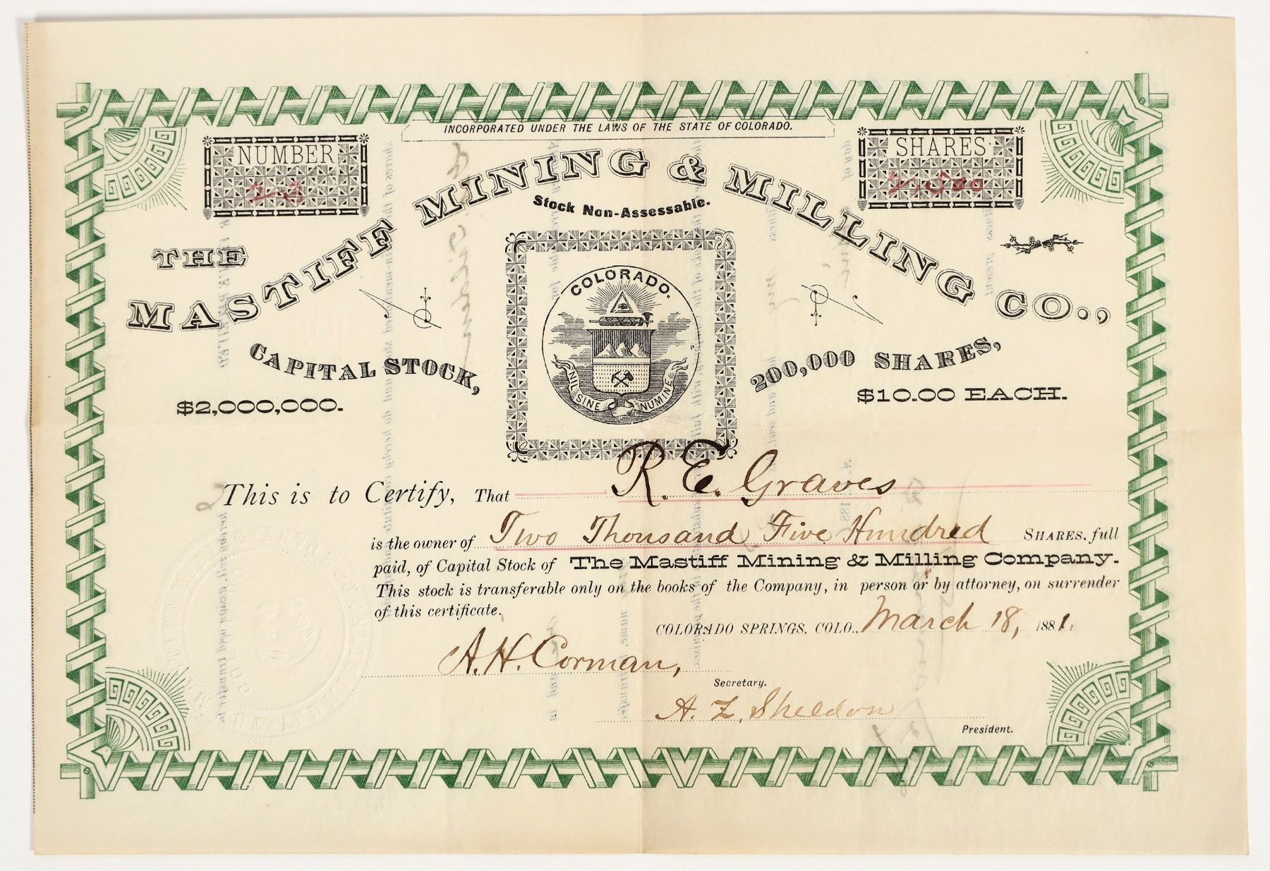 Rare. Inc. in Colorado. No. 23, issued for 2,500 shares to RE Graves in Colorado Springs in 1881. Signed by president AL Sheldon and secretary AH Corman. Not cancelled. Green border, black print, and Colorado state seal vignette. Folds, some toning. Operated a mine at Colorado City near Hangman's Gulch at the entrance to Red Rock Canyon. They also worked near Bear Creek Canyon. (The Weekly Gazette, Dec. 18, 1880)
