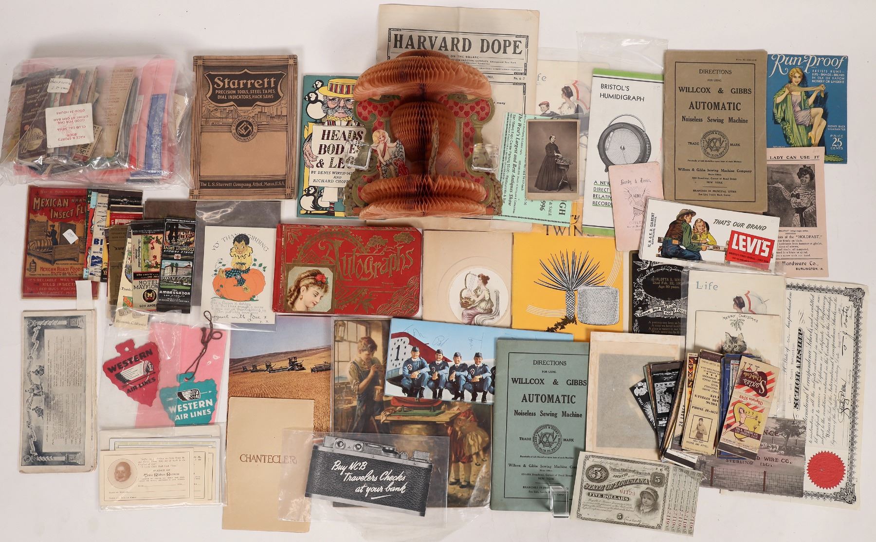 Over 40 items. Collection of odds and ends : Heads, Bodies and Legs book matching the different parts. Book "Story of Twine". Catalogs: Wilcox & Gibbs sewing machines, Starrett tools, Westinghouse sewing machines. An Autograph book dateline May 2 1899 (no autographs). A bag of well over 70 matchbook covers. An expandable 3D valentines bell card. State of Louisiana $5 bonds 1873. International Correspondence Schools scholarship cert. dated 1906. Calif. missions stamps. Women's Christian Temperance cards. U.S> Presidents Gallery Senate pass w/Lyndon Johnsons signature (I found no card in research that matched this from Congressional web site.) There is a lot more items to look through.