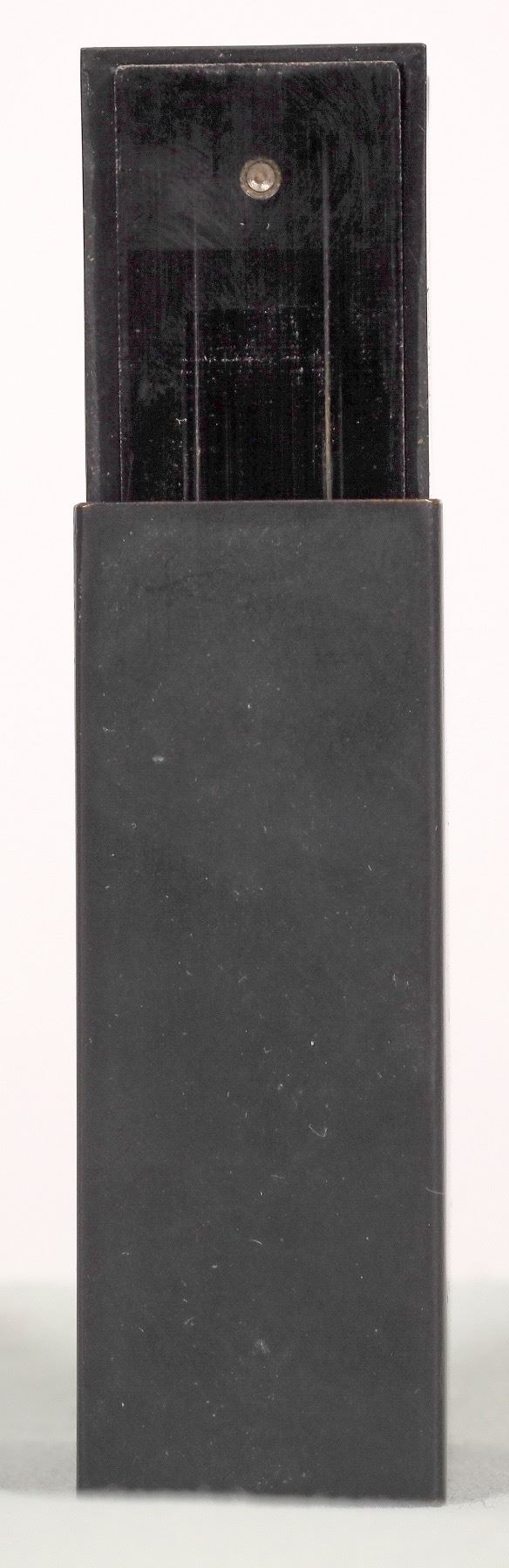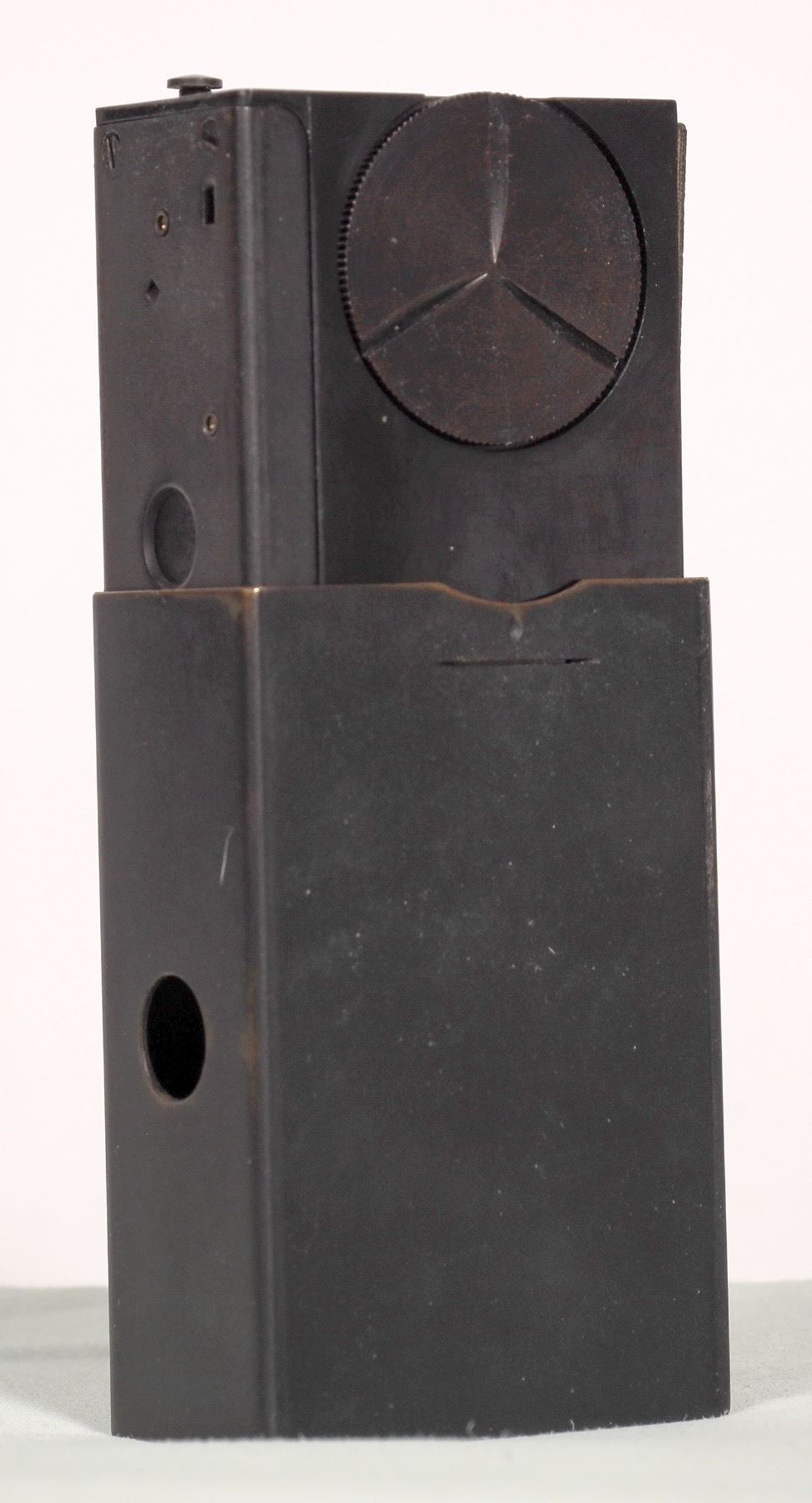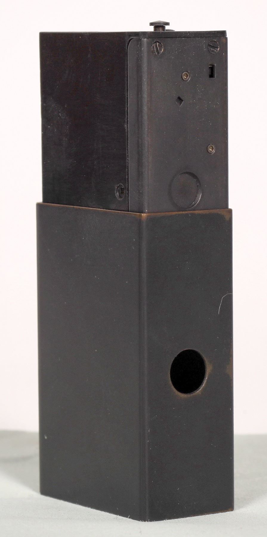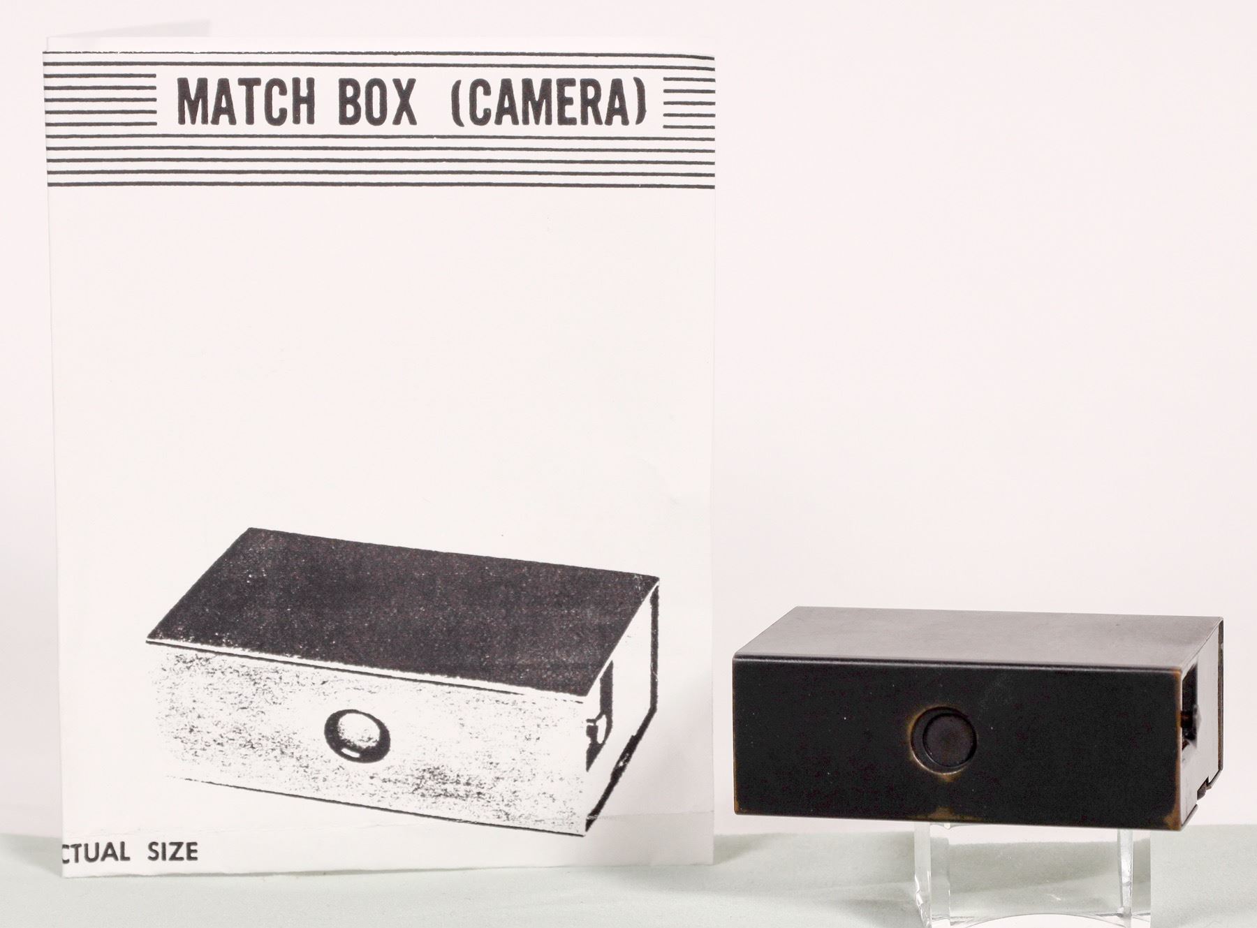 Manufactured by Eastman Kodak Co., Rochester, New York. Made for Office of Strategic Services (OSS). Dimensions are 2 3/8 x 1 1/2 x 7/8 inches. The wide angle lens is on one side edge. Lens has two openings, f.5 and f.16. It was made in the shape of a matchbox of that era. It could be disguised by adding a matchbox label appropriate for the country in which it was to be used. The camera used 16-mm film. It was deployed ìbehind the linesî by resistance personnel in World War II for target recording and propaganda photography.