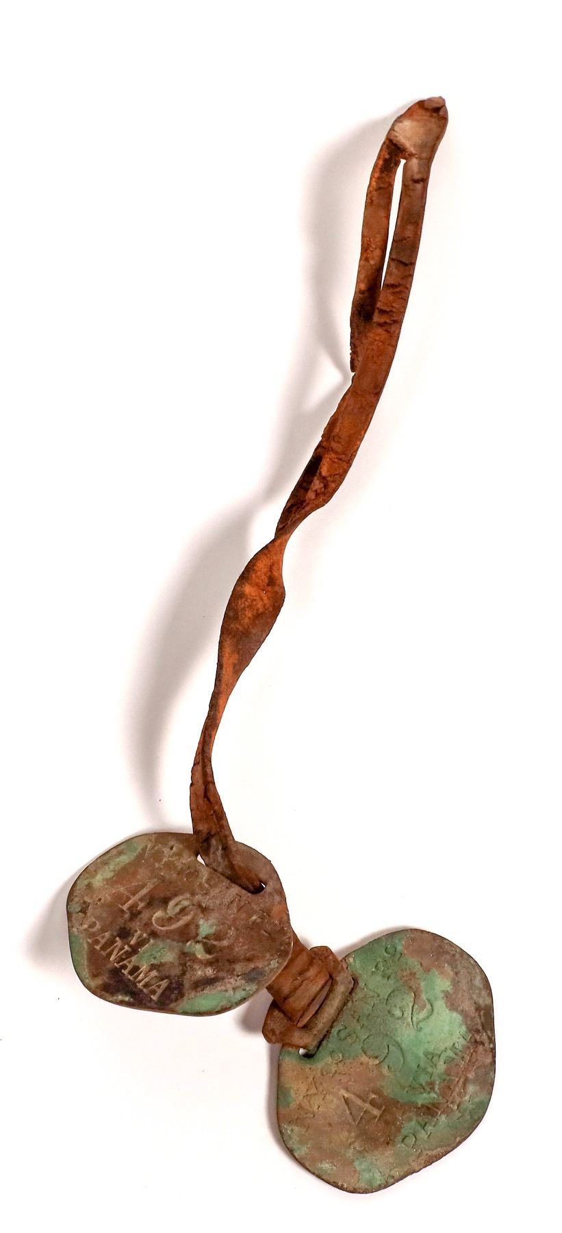 A matched pair of luggage tags with full 9î original leather fob. #492 ìSan Fo to N.Y. via Panamaî Ovoid, rounded diamond shaped, 2î x 1 5/8î. Desalinated and stabilized; fully legible. This tag would have been used for luggage originating in New York and bound for California, transferring across Panama on the Panama Railroad, and then onto a Pacific Mail Steamship Co. vessel for the final trip to San Francisco.