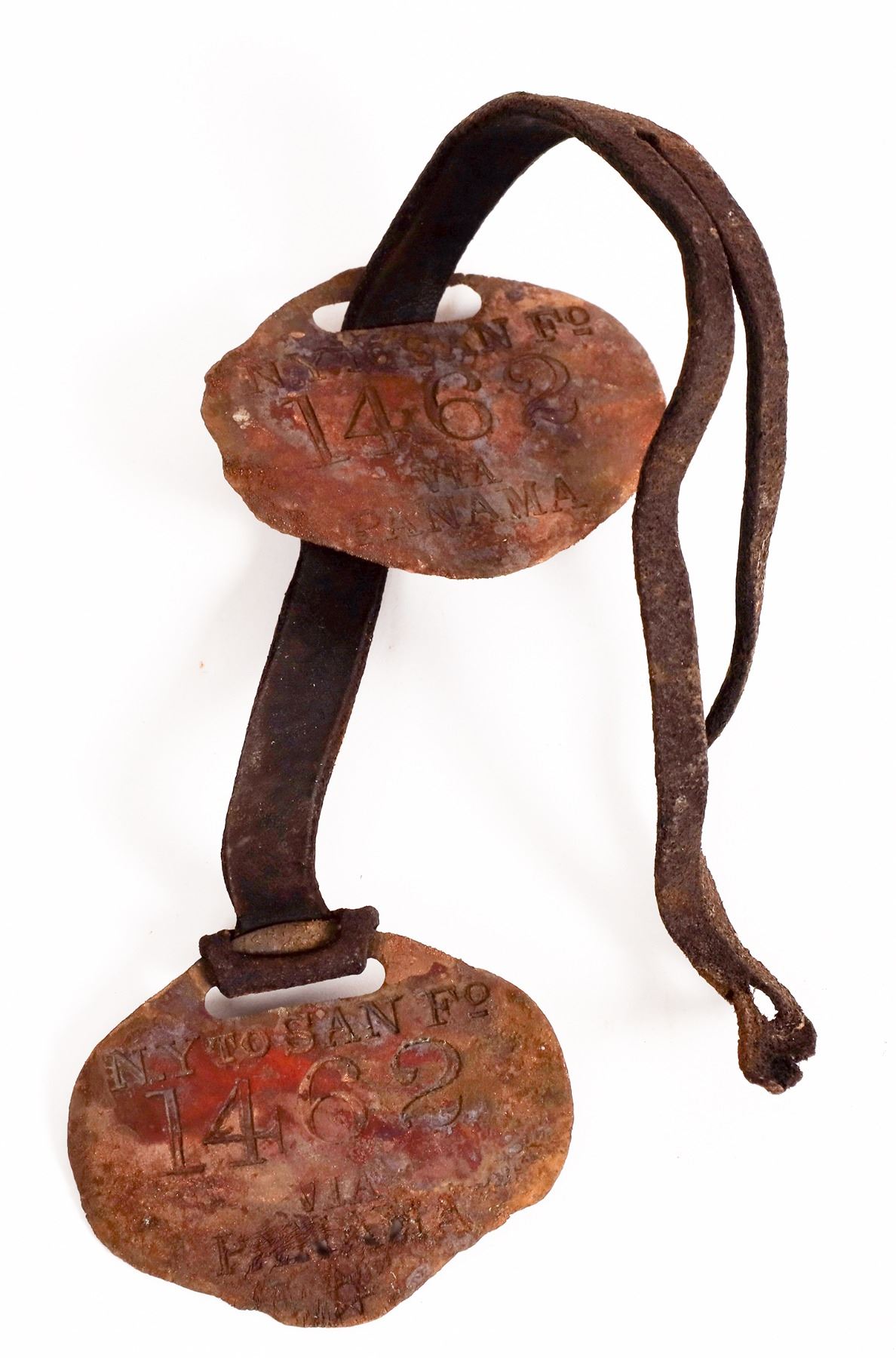 Matched pair of metal, likely brass, luggage tags on a leather fob. NY To San Fo/1462/Via Panama. Tags 1.5x2"(1 has some degradation), fob about 7".