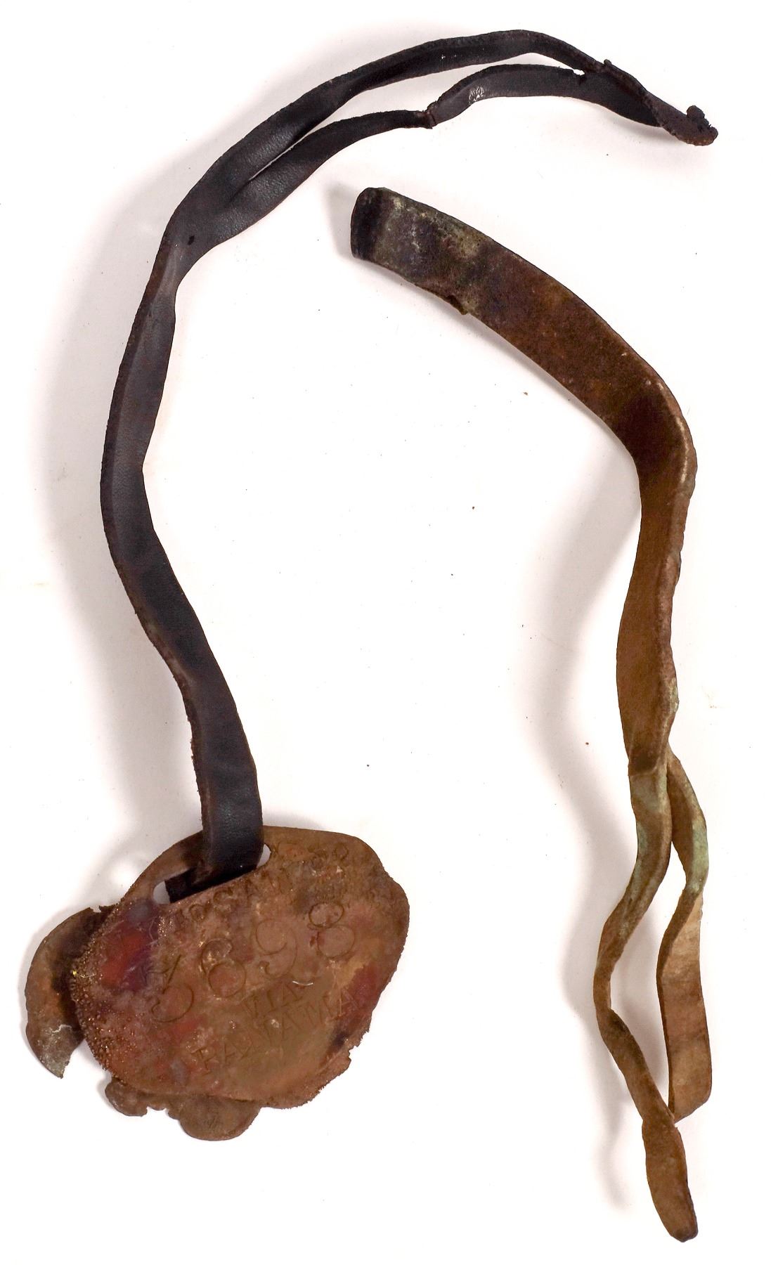 Matched pair of metal luggage tags with 2 leather fobs. NY To San Fo./3698/Via Panama. Tag 1.5x2", 1 more heavily degraded. Fobs about 7", 1 detached.