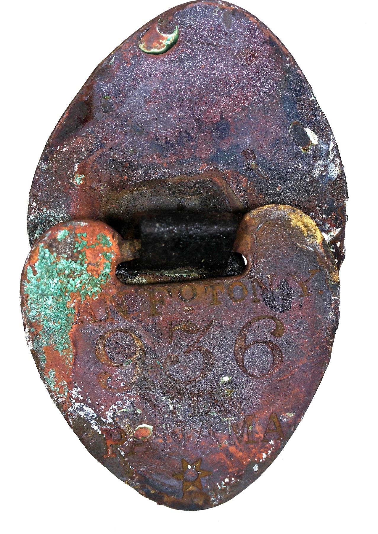 A matched pair of luggage tags, San Francisco to NY Via Panama, #936 with stub leather strap. 1 has a 6 point star. The route started on the SS Sonora to Panama, then via Panama Railroad and ultimately onto the SS Central America.