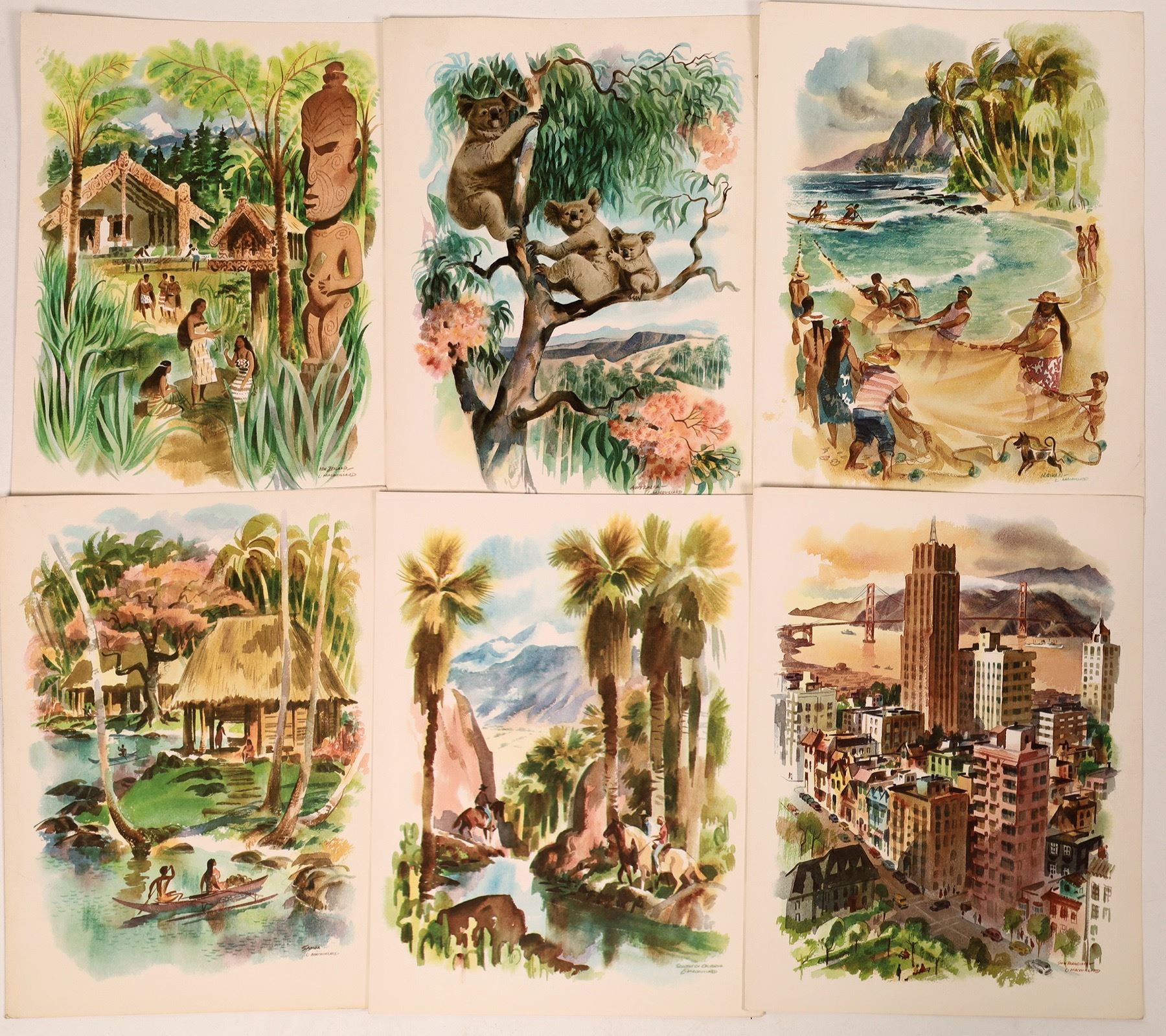 This is a collection of Matson Cruise Lines dinner menus from the SS. Mariposa. A total of six (6) menus with art by Louis Macoullard. The art locations illustrated are: New Zealand, Australia, Hawaii , Samoa, Southern California, and San Francisco. Some foxing, perfect for framing. City: State: Date:1962