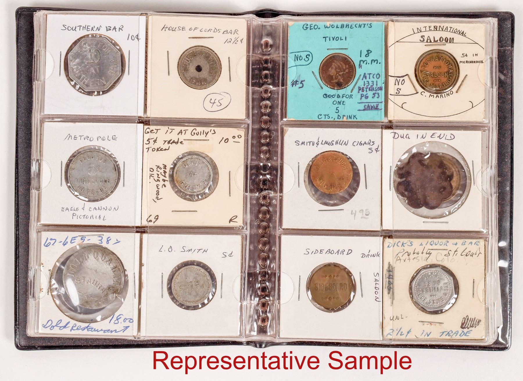 Album of 61 maverick tokens with interesting notes on where they were dug, or possible attributions. International Saloon; House of Lords Bar; Southern Bar; Gold Star Saloon; Empire Saloon; Bank Saloon and many others. Research opportunity!!