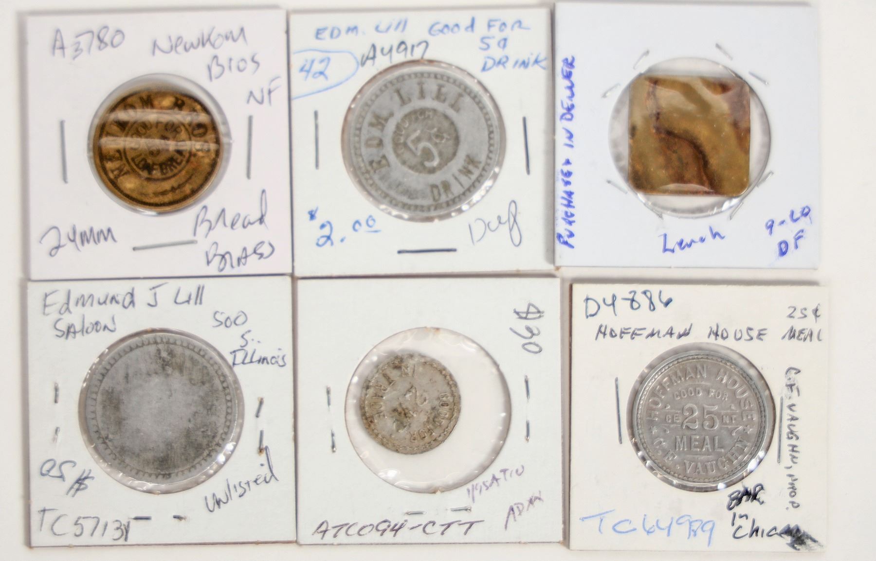 Maverick tokens, some identified from newspapers.com data. Ozark Billiard Parlor; F.C. Schultz (square token); Hoffman House, C.E. Vaughn; Newcom Bros.; Edm. Lill (two pcs).