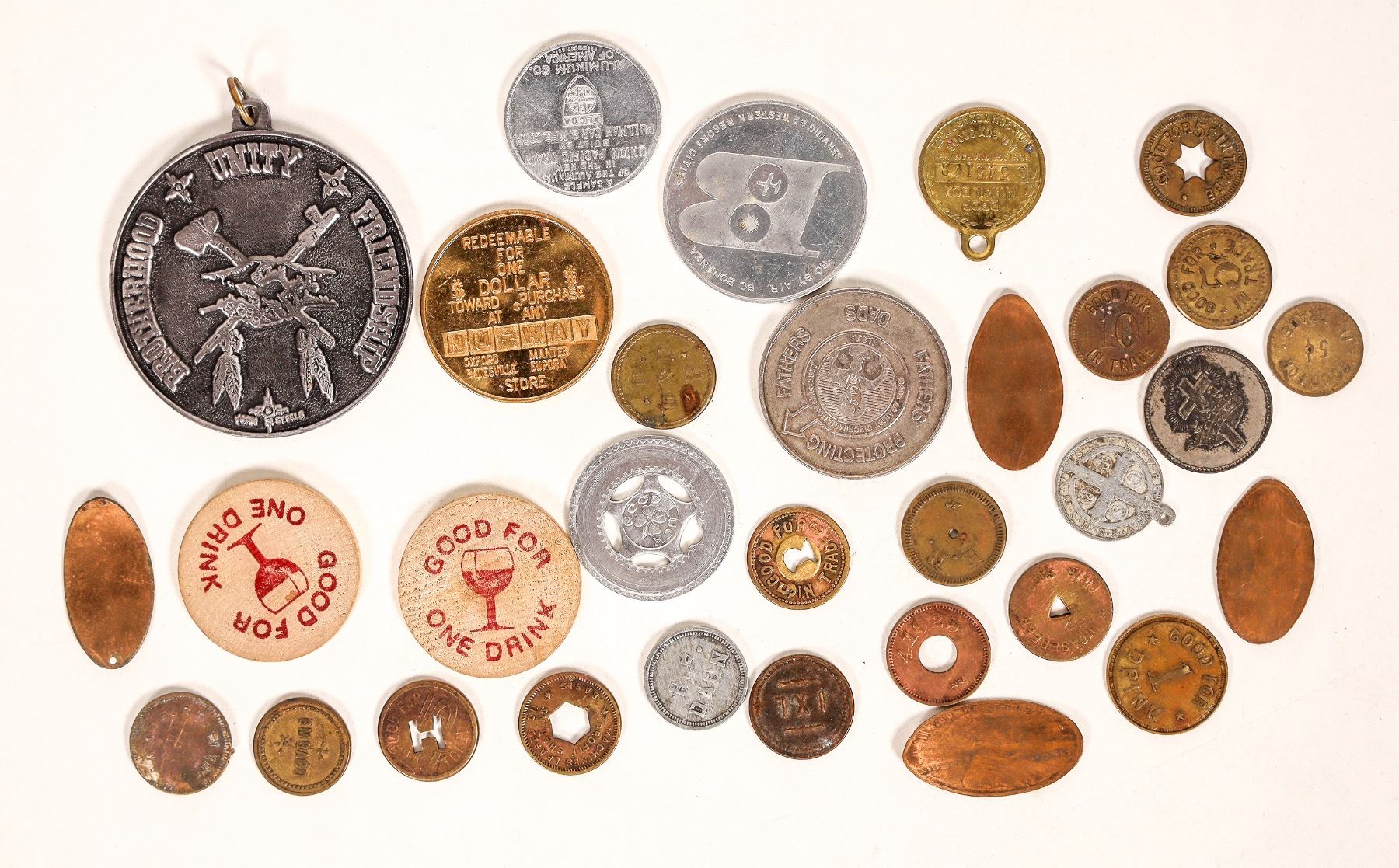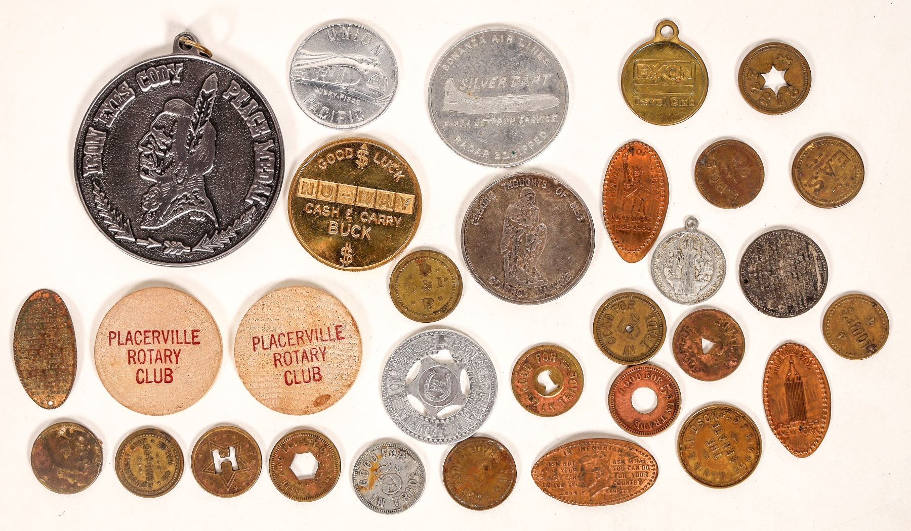 Over thirty miscellaneous maverick tokens; elongated pennies; wooden nickels from the Placerville Rotary Club (2); Iron Eyes Cody peace medal. [