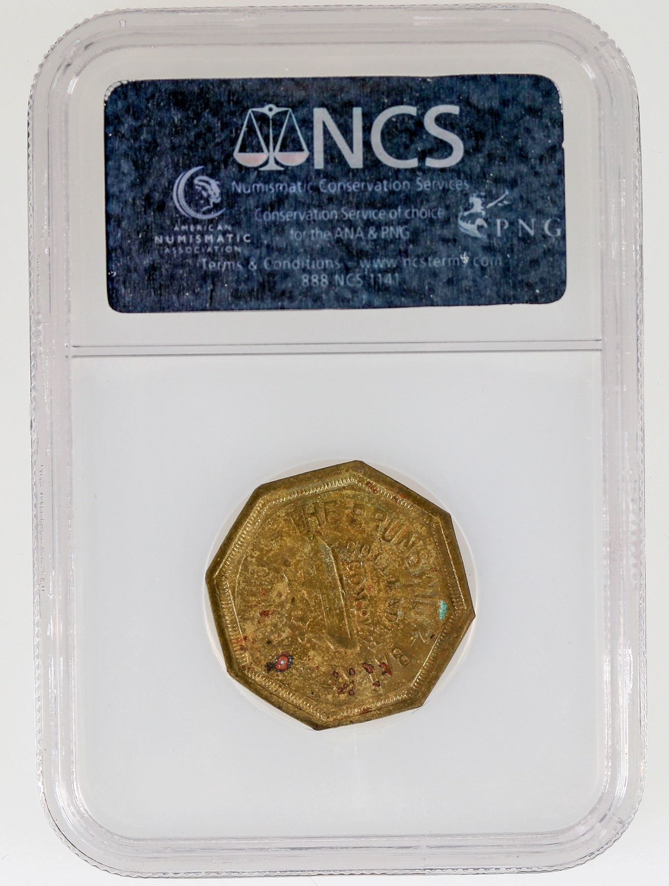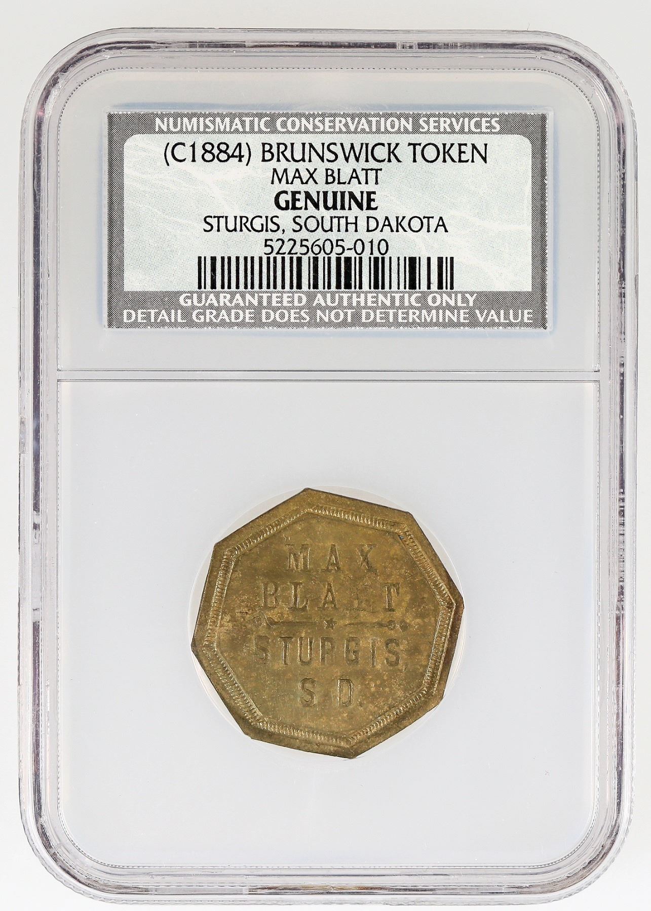 Possibly territorial. NCS certified Genuine: MAX / BLATT, / STURGIS, / S.D. // THE BRUNSWICK-BALKE / COLLENDER / COMPY. / CHECK; Br., octagonal, 26 mm.
