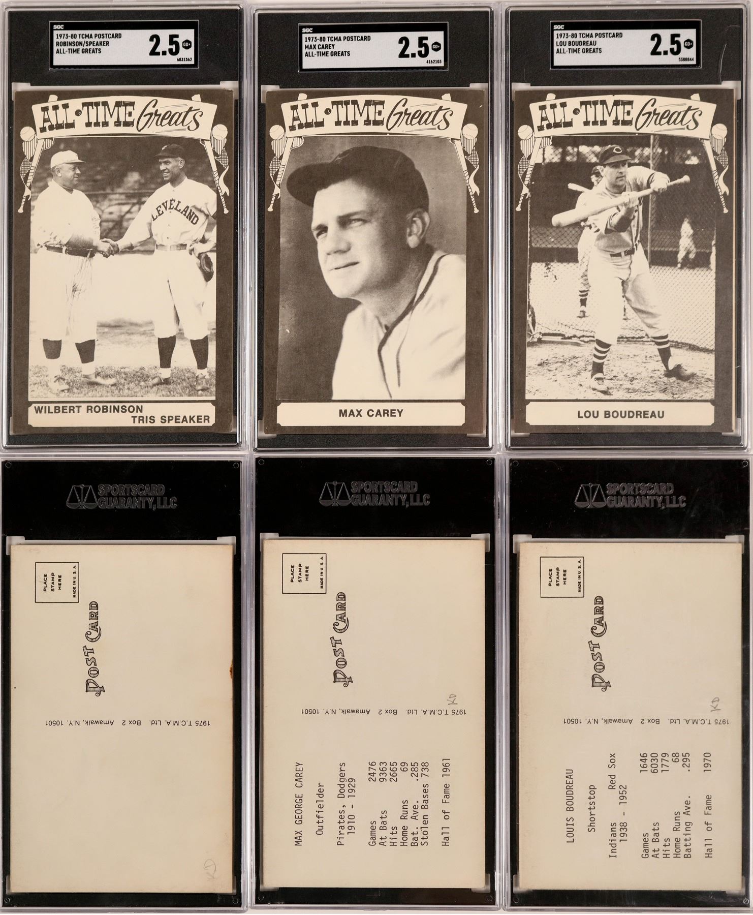 Three TCMA postcards, featuring HOF shortstop Lou Boudreau, outfielder Max Carey and managers Wilbert Robinson & Tris Speaker. All are in good condition. See photos for more details.