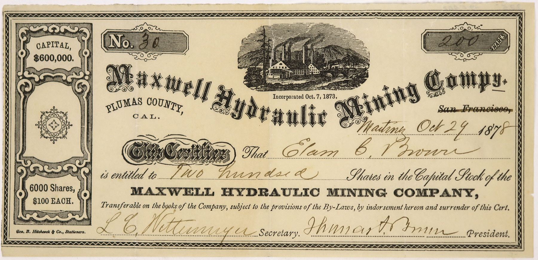 Rare. "Plumas County, Cal." (printed under title). Inc. Oct. 7, 1873. No. 30, issued for 200 shares to Elam Brown on Oct. 29th, 1878 in Martinez. Signed by president Thomas Brown and the secretary. Not cancelled. Black border and print. Vignette of mine. Printed by Geo. B. Hitchcock & Co., Stationers. Folds, toning, archival tape repairs. 4 x 8.5" According to the Daily Alta California, Oct. 7th, 1873, the company was formed to extend the Maxwell Mining Company's ditch "down Spanish Creek and the Feather River to a point about 25 miles, and to use the same for gold mining and for other purposes." City:Plumas County State:California Date:1878