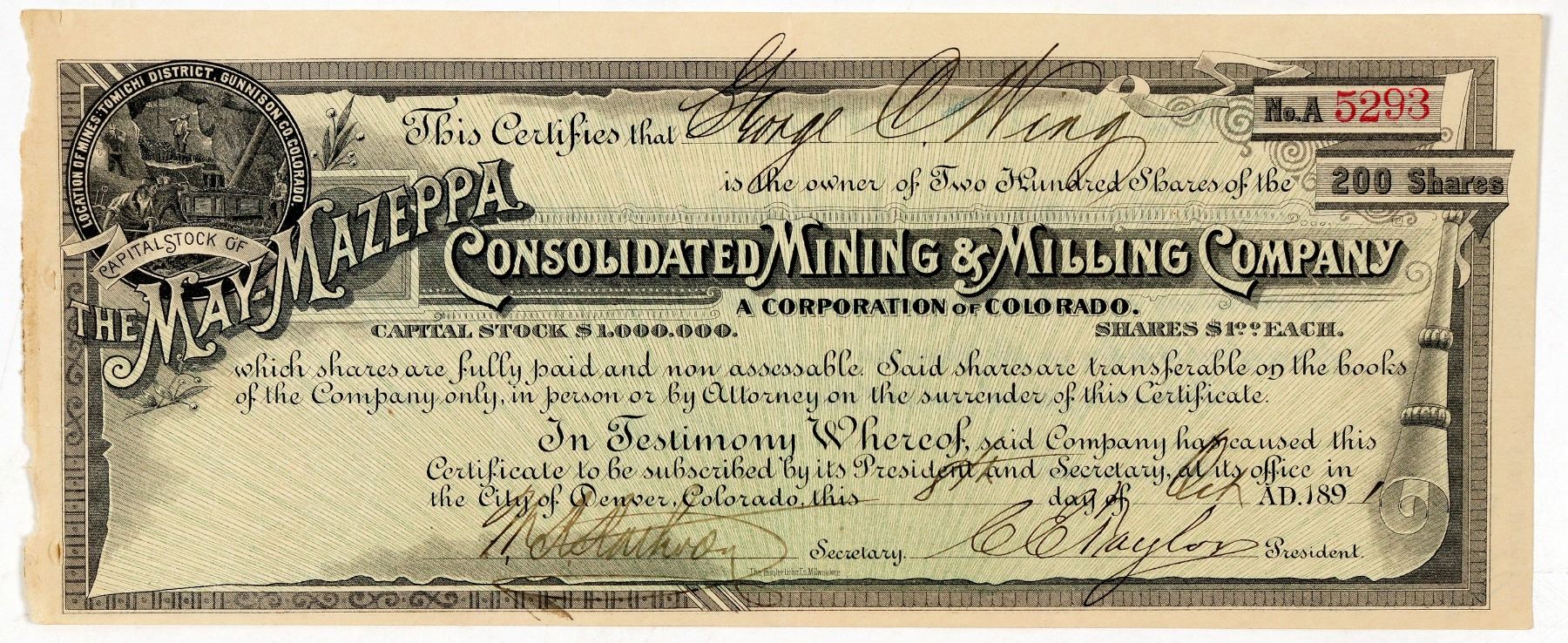 Rare. Location of Mines: Tomichi District, Gunnison Co., Colorado. (printed around vignette). No. A.5293, issued for 200 shares to George C. Wing on Oct. 8th, 1891. Signed by president C.E. Taylor and the secretary. Not cancelled. Small, currency-sized certificate. Black border, green background, tiny mining vignette. Pinholes, rough left edge. 3.75 x 9" Located at North Star (according to Poole Bros., 1898). () Ken Prag Collection