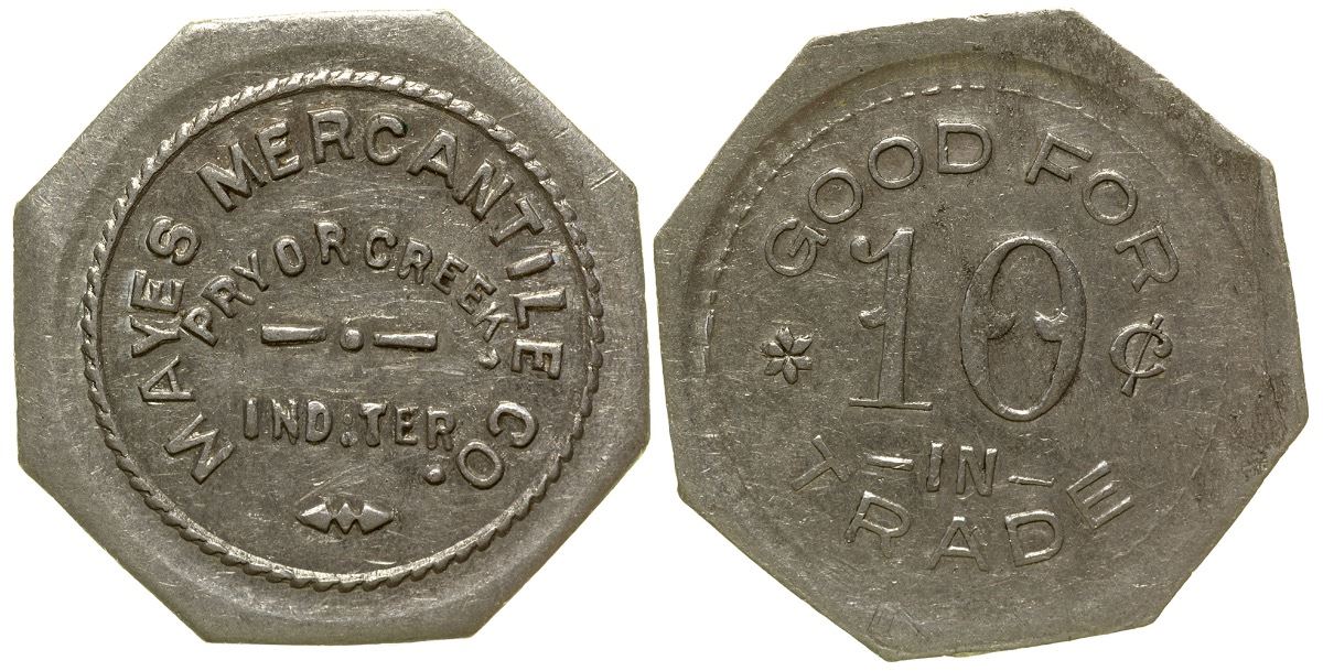 Obv.: Mayes Merchantile co. / Pryor Creek / Ind. Ter.; Rev.: Good For / 10c / In Trade. Oct., Al. 27mm. Superb condition for this rare token. City: Pryor Creek State: Indian Territory Date: ID# 45205