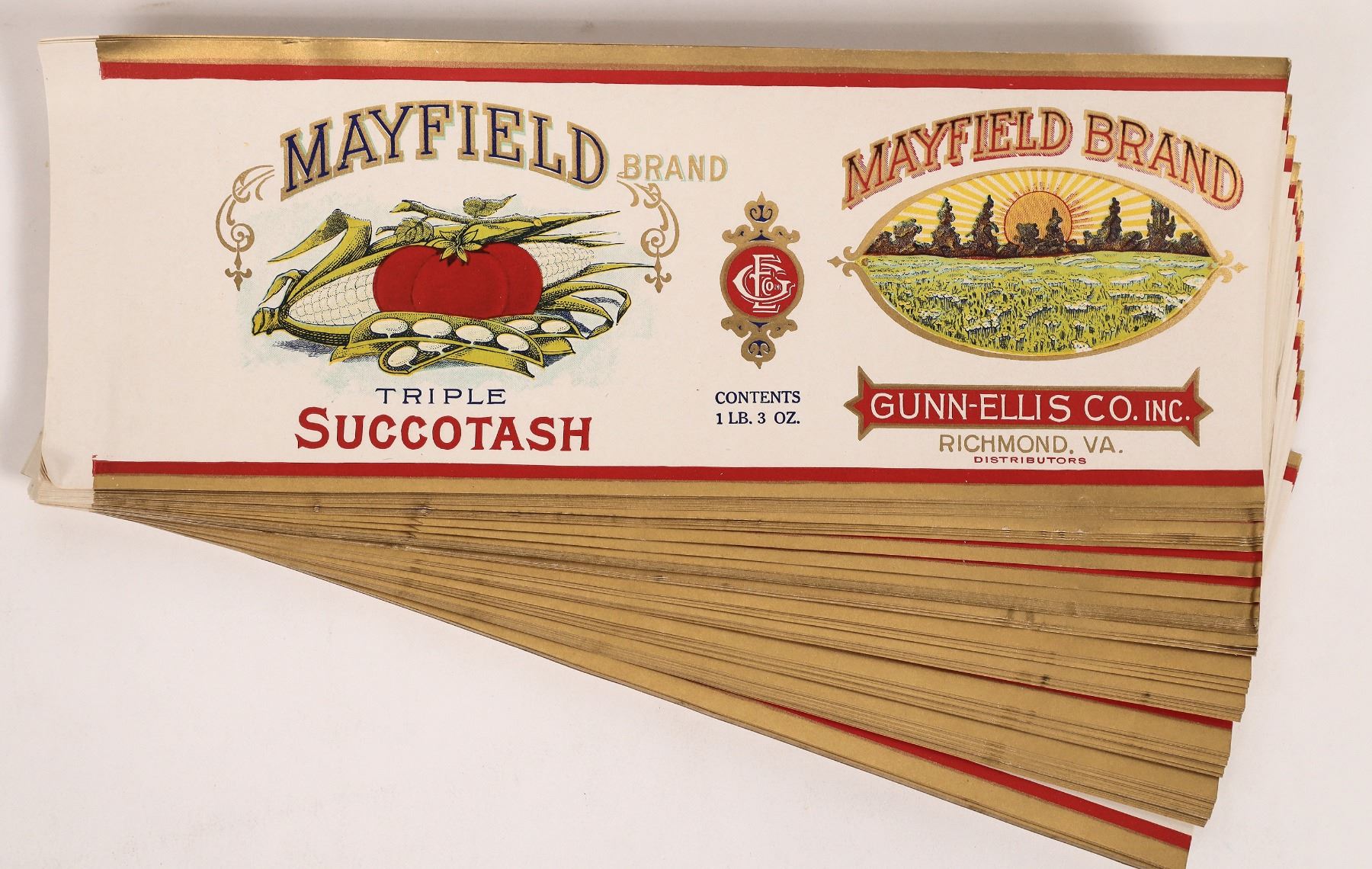 Paper labels for cans of Mayfield Brand Triple Succotash distributed by Gunn-Ellis Co. Inc. of Richmond, Virginia, 20 oz. Crisp white background with gold and red borders on the long edges, idyllic sunrise scene over a blooming field on the right, and an illustration of a fresh tomato, white corn on the cob, and white beans with open pods on the left. 11.25 x 4.25", ~100 pieces.