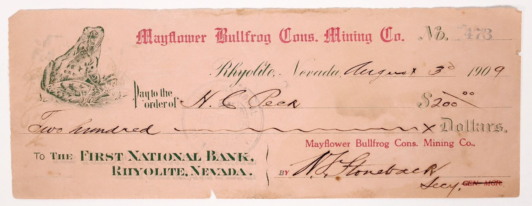 Rare 1909 Mayflower at Pioneer, pictorial Mayflower Bullfrog Cons. Mining check with bullfrog vignette. Small tears, toning etc. Please inspect.