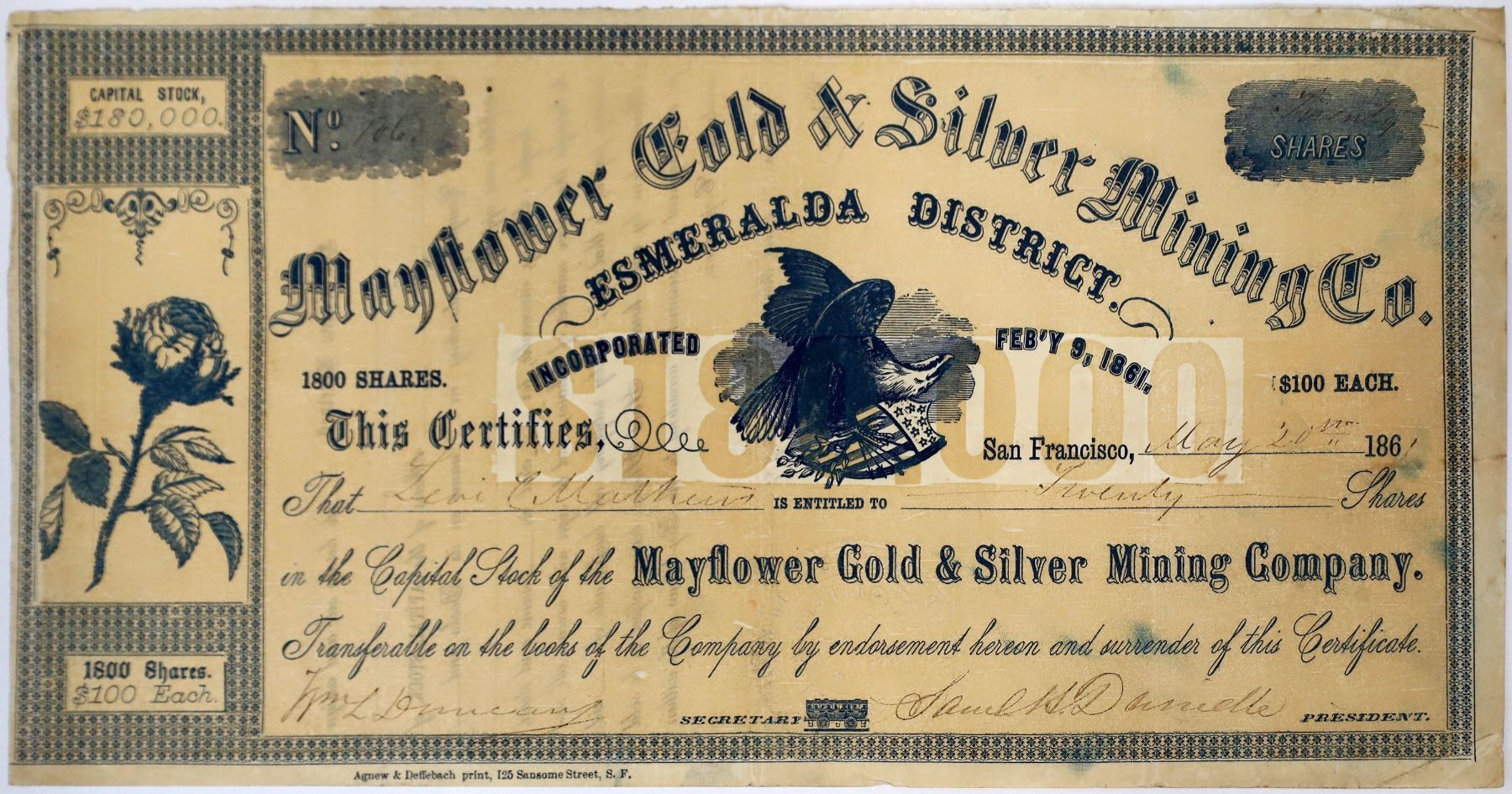 # 106 for 20 shares to Levi C. Mathews. Signed by William L. Duneany(?) and president Samuel H. Dwinelle (attorney). Dateline San Francisco May 20, 1861, Incorporated February 6, 1861. Not cancelled. Blue on tan. Eagle and shield vignette and rose vignette. Underprint '$180,000.' Agnew & Deffebach printer. Cut roughly at left. Light corner folds. Light discoloration. etc. Writing is fading. Still quite nice. One could make an argument that the Mayflower was in California, Utah or Nevada when it was incorporated. Discussion of these three options included. We could not find any information on this company: online newspaper searches, Google, history books, directories, etc.