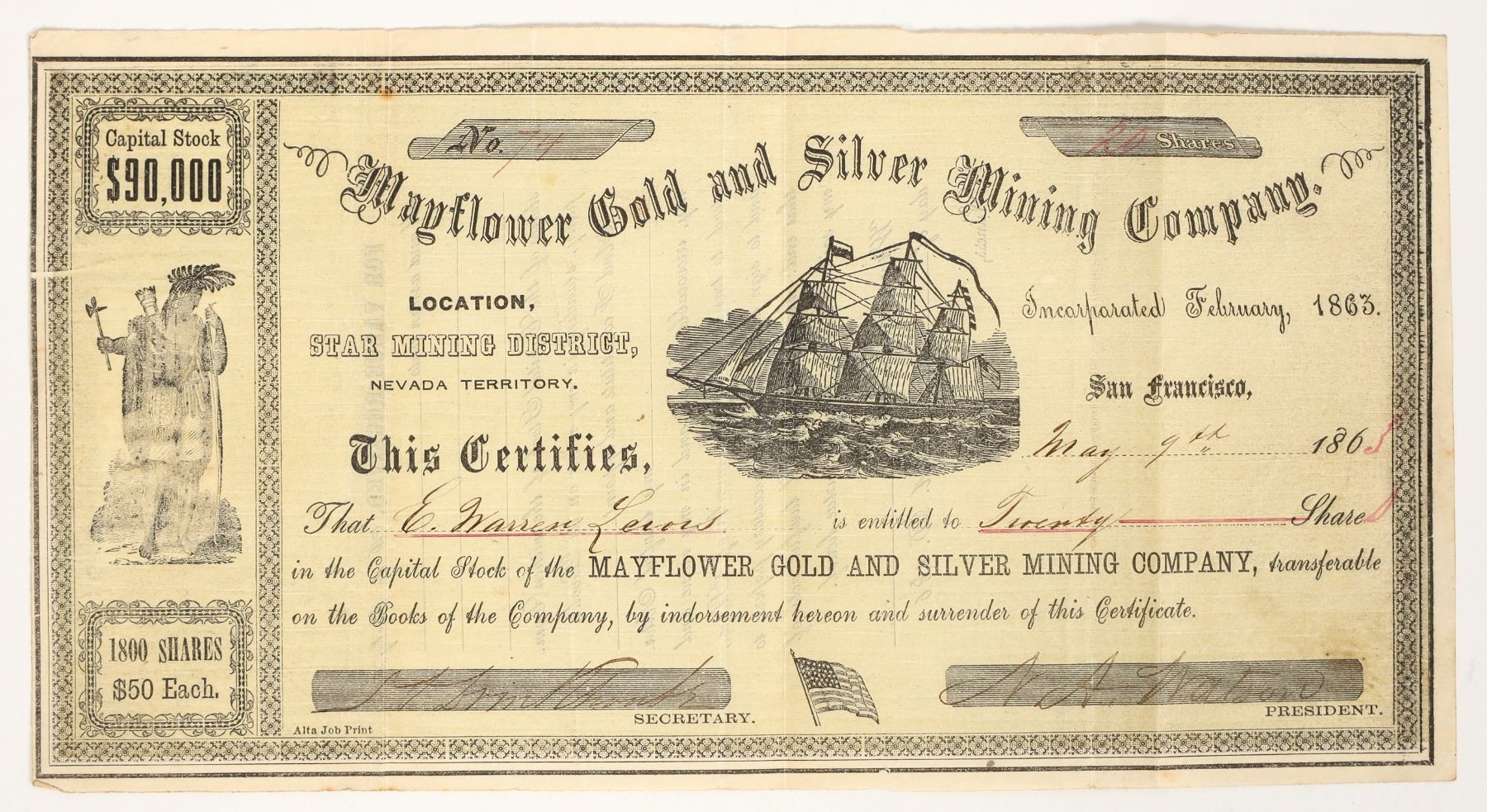 "Location, Star Mining District, Nevada Territory" printed on certificate. No. 74, issued for 20 shares to E. Warren in May 1863 in San Francisco. Signed by president NA Watson and the secretary. Not cancelled. Fabulous design with a vignette of the Mayflower! Alta Job Print. Folds, creases. The Star Mining District is located at Star City in present-day Pershing County, Nevada. It was formed in 1861. We have not sold this piece before!