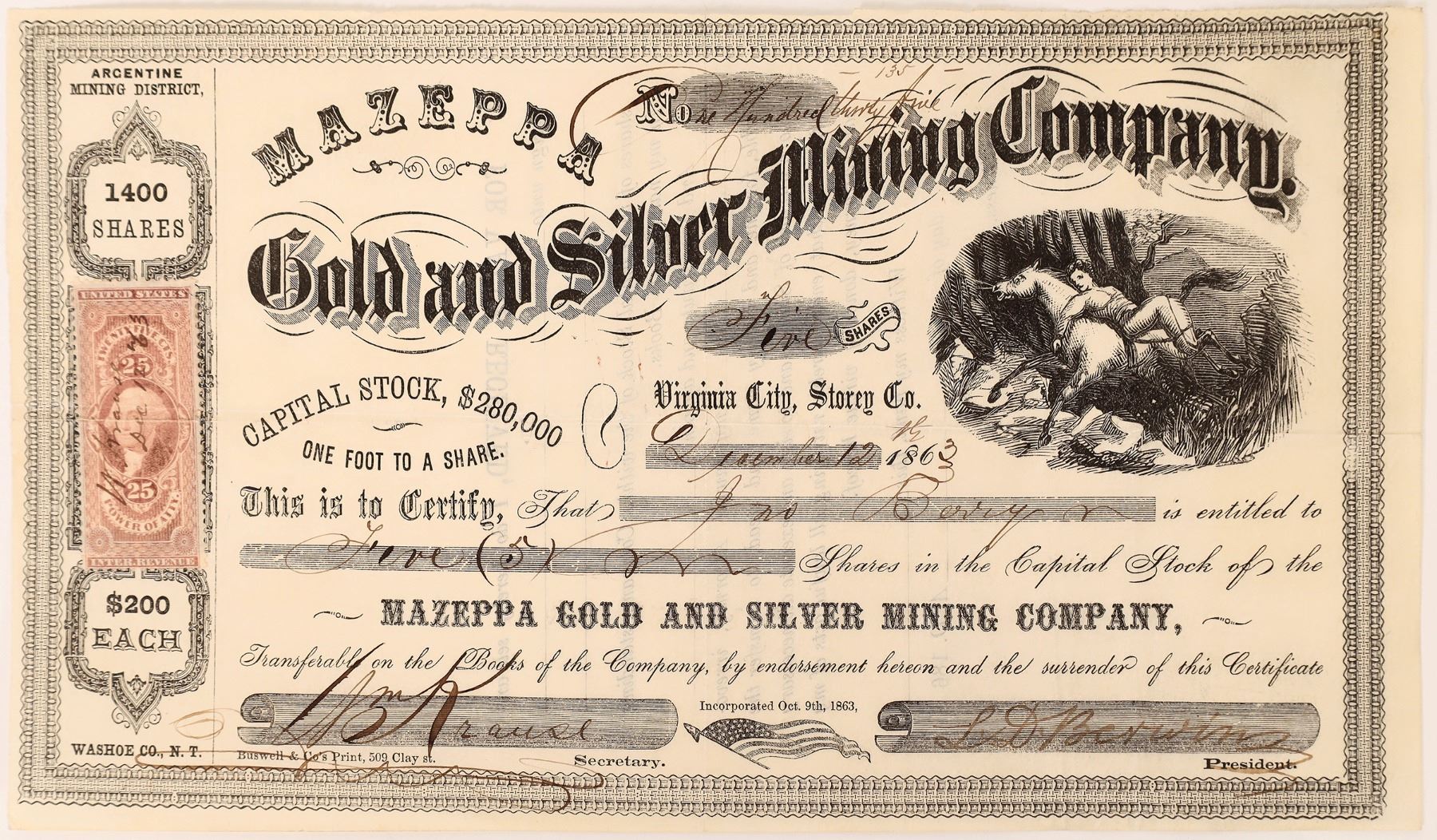 Stock certificate for five shares at $200 per for Mazeppa Gold and Silver Mining Company in Virginia City, Storey County. It is issued to John Berry (Illegible) and is signed by L.D. Bevins (?) and secretary Krause. Attached is a 25 cent red Washington Power of Attorney hand cancelled Revenue stamp. This is a territorial piece in nice condition. Virginia City Nevada December 12, 1863