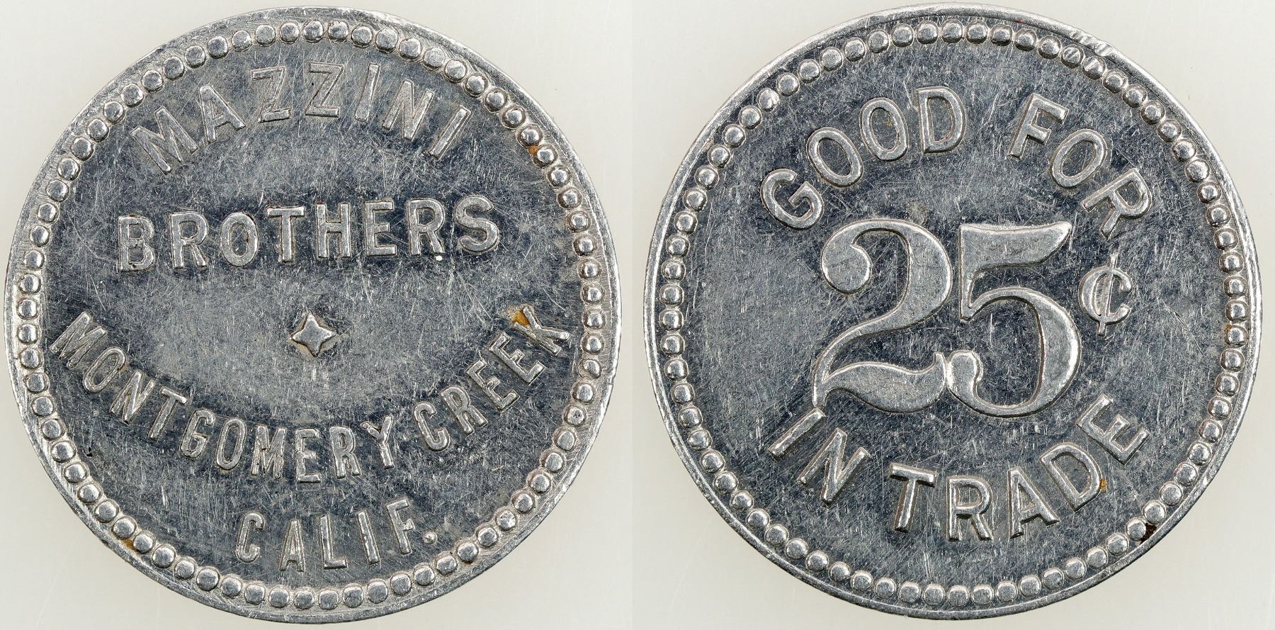 Round aluminum 1" Mazzini Brothers/Montgomery Creek/Calif.//GF/25c/IT token. Very rare, not listed in Kappan. Montgomery Creek Colorado