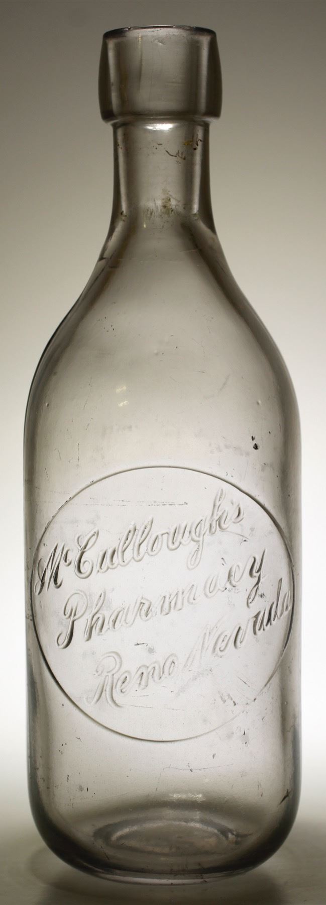 Embossed within a circle, on the front of the bottle is: Mc Cullough ( su) / Pharmacy ( su ) / Reno, Nevada ) (su) // Extremely rare, Large 8" , Citrate of Magnesia bottle. Long tapered collar, tooled top. Made for less than one year. Only one known example, believed to exist...THIS IS THE ONE...Perfect, except for a tiny amount of scratching, on the reverse side of the bottle. State: Nevada City: Reno Date: 1895-1905 HWAC# 59216
