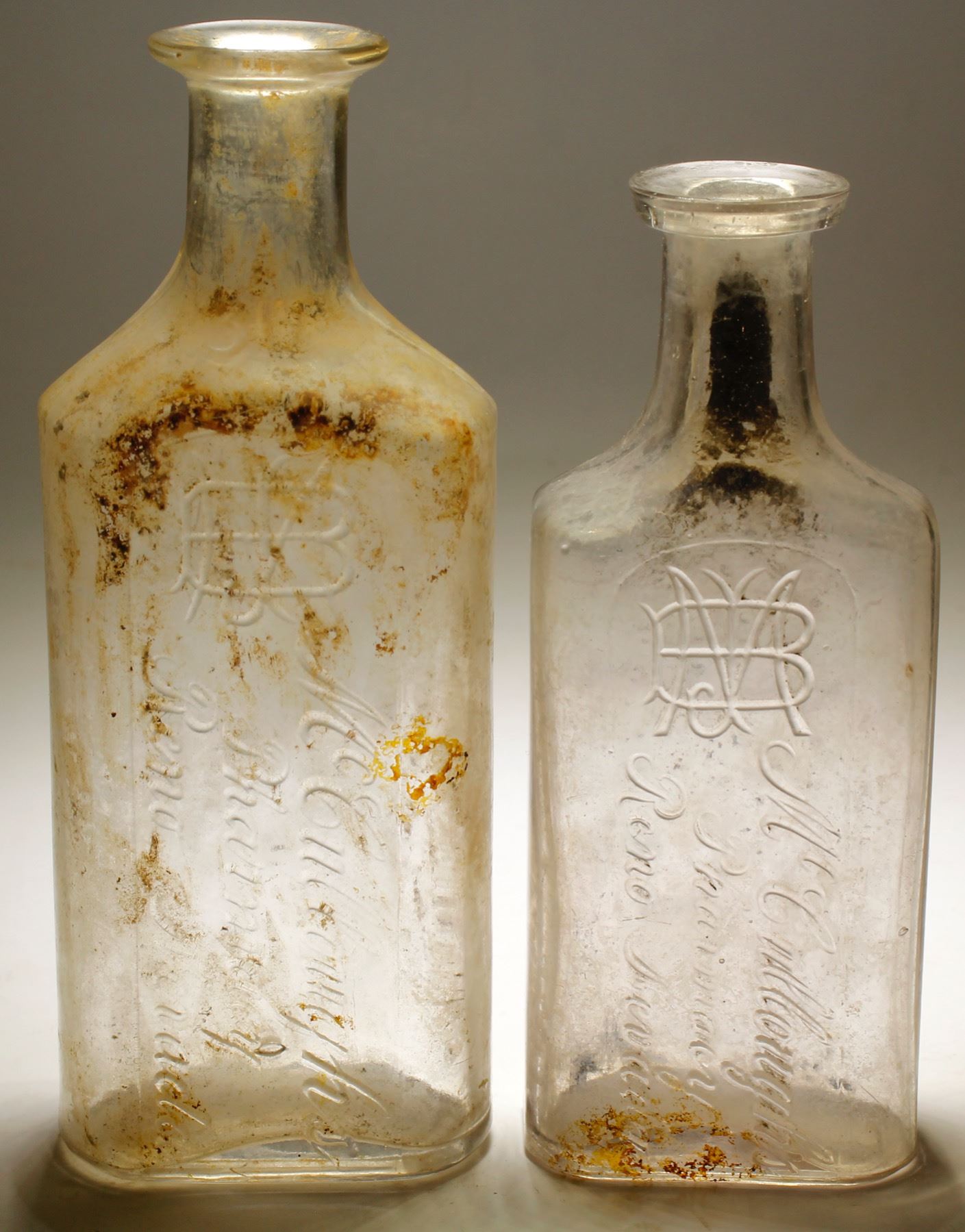 ( Both bottles, embossed in script ) Item #1 of 2 : ( Monogram : J. B. M. , at shoulder ): Mc Cullough's / Pharmacy / Reno, Nev. // Base : Unembossed , sunken panel // . Clear, flared lip, tooled top, 5 1/2" x 2 1/8" in size. Dug bottle with some dirt and haze, but should clean well. Good condition, except for a pinhead on the top. Lot #2 of 2: Same bottle , same embossing, except smaller in size, 4 3/4" x 1 15/16" . BASE: W.T. & Co / N / U.S. A./ Pat. Dec. 11 . 1894. Clear, tooled top, with just a hint of dirt and haze. Very nice pair, they just need a bath !! State: Nevada City: Reno Date: 1895-1900 HWAC# 61421