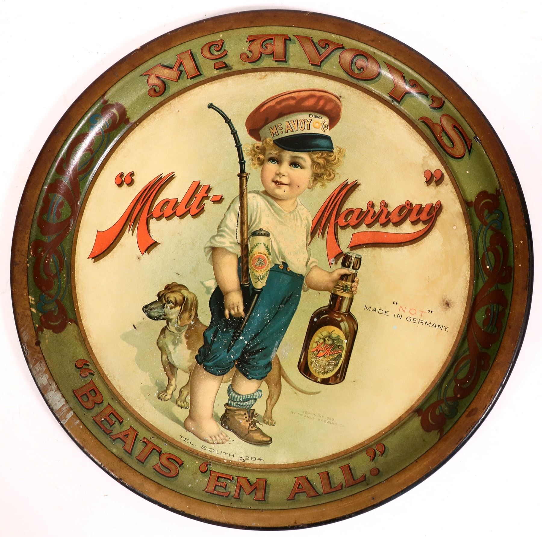 This 12 in. beer tray is for the "Mc Avory's/ Beats'em All" featuring m"Malt-Marrow" "not made in Germany". copyright 1899/ by Mc Avory Brewing Co.". Minor dents in base light oxidation, fair to good condition. . Chicago Illinois 1899