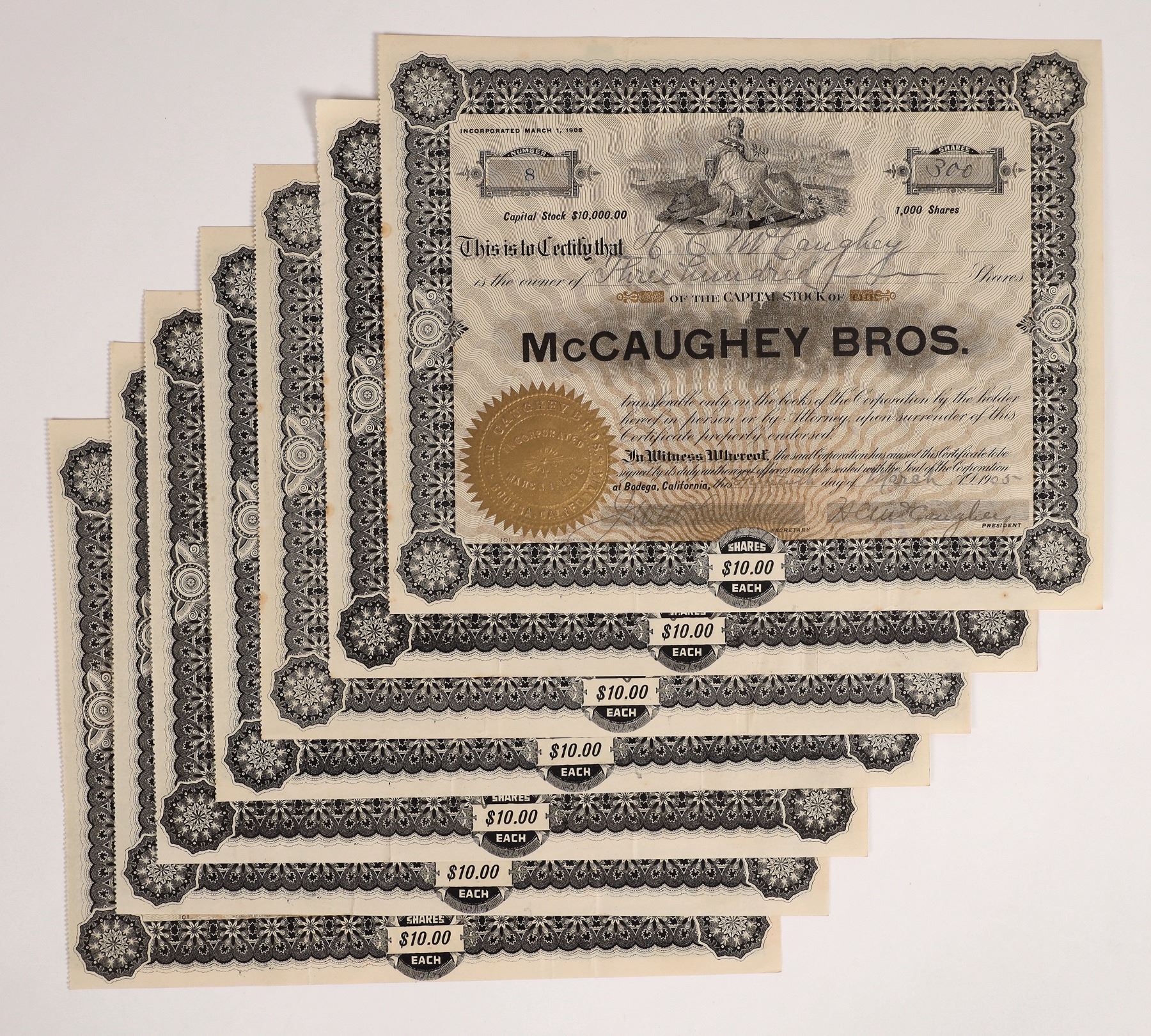 Lot of 7 stocks, issued 1905-1909. Inc. March 1, 1905. These are early stock issues, #4, 5, 7, 8, 10, 11, and 12. Three are issued to the company president, H. McCaughey; two are issued to secretary J. McCaughey; one to Elsie McCaughey; and one to W. Cunningham. Not cancelled. Black border, gold seal, and allegorical vignette. Dateline Bodega, Califorina. The McCaughey Brothers Mercantile Store dates back to the 1800s in Bodega. Rare Sonoma County location. California Bodega 1905-1909 Ken Prag Collection