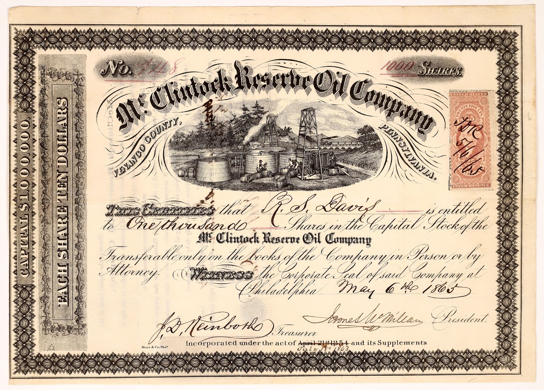 "Venango County, Pennsylvania" printed on either side of vignette of oil derrick, tanks, and barrels being filled. No. 748, issued for 1,000 shares to RS Davis in Philadelphia in 1865. Signed by president Millan(?) and treasurer Reinboth. Not cancelled. 25 cent US IR Certificate stamp attached on the upper right. Deep folds, bent corners. 7.5 x 10.25" Company owned the John McClintock Reserve located at the junction of Oil Creek and Cherry Run. Total about 4 acres. Two wells in full production. [The Evening Telegraph, Dec. 14th 1864]