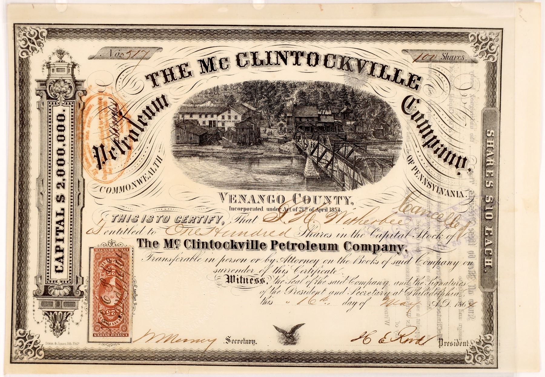 "Venango County" (printed under vignette). Inc. under Act of April 1854. No. 517, issued for 100 shares to Witherbee in Philadelphia in 1864. Signed by the president (illegible) and secretary Mooney. Pen cancelled. Black border and print. Beautiful vignette of bridge over river near village with one building labelled "McClintock House." Printed by Stein & Jones, Philadelphia. 25 cent US IR Certificate stamp attached at bottom left. Company stamp to the left of vignette. 8 x 11.5" Folds. Owned the Greenfield, Wright, & Whitman wells on the McClintock Farm at Oil Creek, Venango County, PA [The Petroleum Centre Daily Record, 26 Jul 1869]. Venango County, Oil Creek Pennsylvania Ken Prag Collection