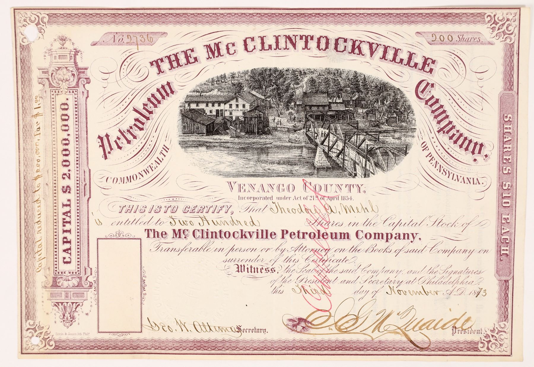 "Venango County" (printed under vignette). Inc. under Act of April 1854. No. 517, issued for 200 shares to Theodore Mehl in Philadelphia in 1873. Signed by president McQuaide and the secretary. Punch hole cancelled on left corners. Purple border and print. Beautiful vignette of bridge over river near village with one building labelled "McClintock House." Printed by Stein & Jones, Philadelphia. 8 x 11.5" Folds. Owned the Greenfield, Wright, & Whitman wells on the famous H. McClintock Farm at Oil Creek, Venango County, PA [The Petroleum Centre Daily Record, 26 Jul 1869]. Venango County, Oil Creek Pennsylvania Ken Prag Collection
