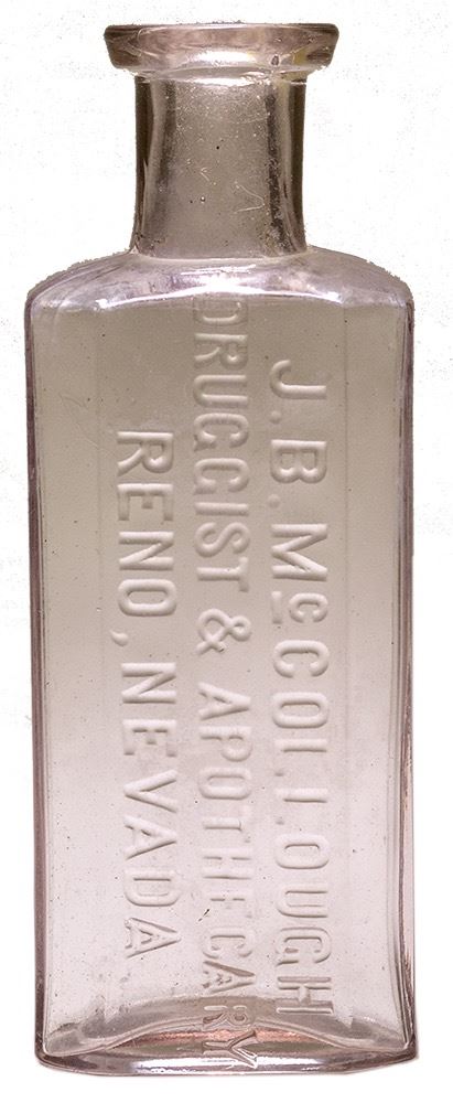J. B. McCollough Druggist & Apothecary Reno, Nevada. This is the exceptionally rare misspelled variety, unknown to most collectors. It is thought they're only about three known. The bottle dates from the 1890s, and has the spelling "MCCOLLOUGH" instead of McCullough. This appears to be a mint example. See Holabird pp193-199. J. B. McCullough ran his drugstore in Reno from 1891-1910 and had a wide variety of embossed bottles. City: Reno State: Nevada Inventory Number: 39509